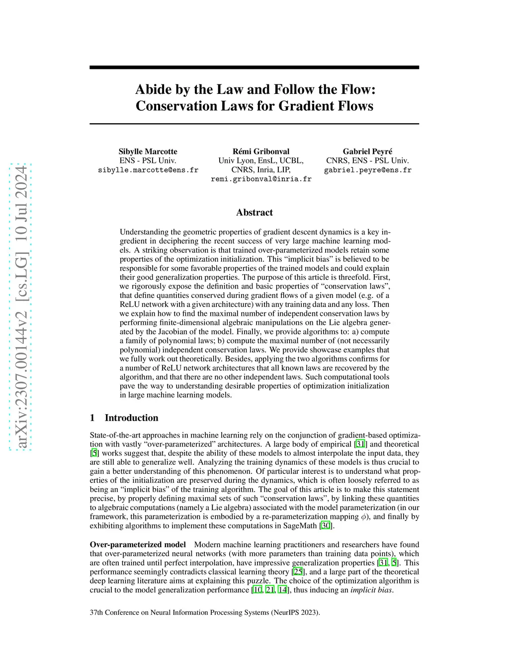 Understanding the geometric properties of gradient descent dynamics is a key ingredient in deciphering the recent success of very large machine learning models. A striking observation is that trained over-parameterized models retain some properties of the optimization initialization. This "implicit bias" is believed to be responsible for some favorable properties of the trained models and could explain their good generalization properties. The purpose of this article is threefold. First, we rigorously expose the definition and basic properties of "conservation laws", that define quantities conserved during gradient flows of a given model (e.g. of a ReLU network with a given architecture) with any training data and any loss. Then we explain how to find the maximal number of independent conservation laws by performing finite-dimensional algebraic manipulations on the Lie algebra generated by the Jacobian of the model. Finally, we provide algorithms to: a) compute a family of polynomial laws; b) compute the maximal number of (not necessarily polynomial) independent conservation laws. We provide showcase examples that we fully work out theoretically. Besides, applying the two algorithms confirms for a number of ReLU network architectures that all known laws are recovered by the algorithm, and that there are no other independent laws. Such computational tools pave the way to understanding desirable properties of optimization initialization in large machine learning models.