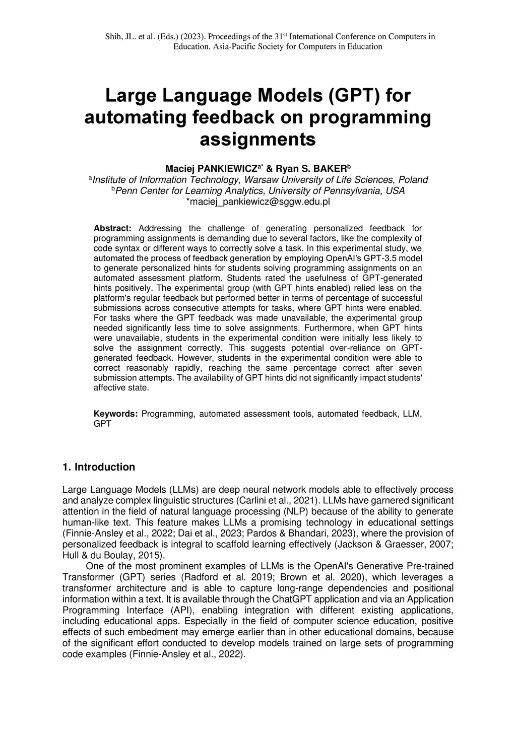 Addressing the challenge of generating personalized feedback for programming assignments is demanding due to several factors, like the complexity of code syntax or different ways to correctly solve a task. In this experimental study, we automated the process of feedback generation by employing OpenAI's GPT-3.5 model to generate personalized hints for students solving programming assignments on an automated assessment platform. Students rated the usefulness of GPT-generated hints positively. The experimental group (with GPT hints enabled) relied less on the platform's regular feedback but performed better in terms of percentage of successful submissions across consecutive attempts for tasks, where GPT hints were enabled. For tasks where the GPT feedback was made unavailable, the experimental group needed significantly less time to solve assignments. Furthermore, when GPT hints were unavailable, students in the experimental condition were initially less likely to solve the assignment correctly. This suggests potential over-reliance on GPT-generated feedback. However, students in the experimental condition were able to correct reasonably rapidly, reaching the same percentage correct after seven submission attempts. The availability of GPT hints did not significantly impact students' affective state.