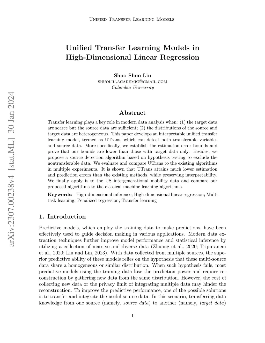 Transfer learning plays a key role in modern data analysis when: (1) the target data are scarce but the source data are sufficient; (2) the distributions of the source and target data are heterogeneous. This paper develops an interpretable unified transfer learning model, termed as UTrans, which can detect both transferable variables and source data. More specifically, we establish the estimation error bounds and prove that our bounds are lower than those with target data only. Besides, we propose a source detection algorithm based on hypothesis testing to exclude the nontransferable data. We evaluate and compare UTrans to the existing algorithms in multiple experiments. It is shown that UTrans attains much lower estimation and prediction errors than the existing methods, while preserving interpretability. We finally apply it to the US intergenerational mobility data and compare our proposed algorithms to the classical machine learning algorithms.