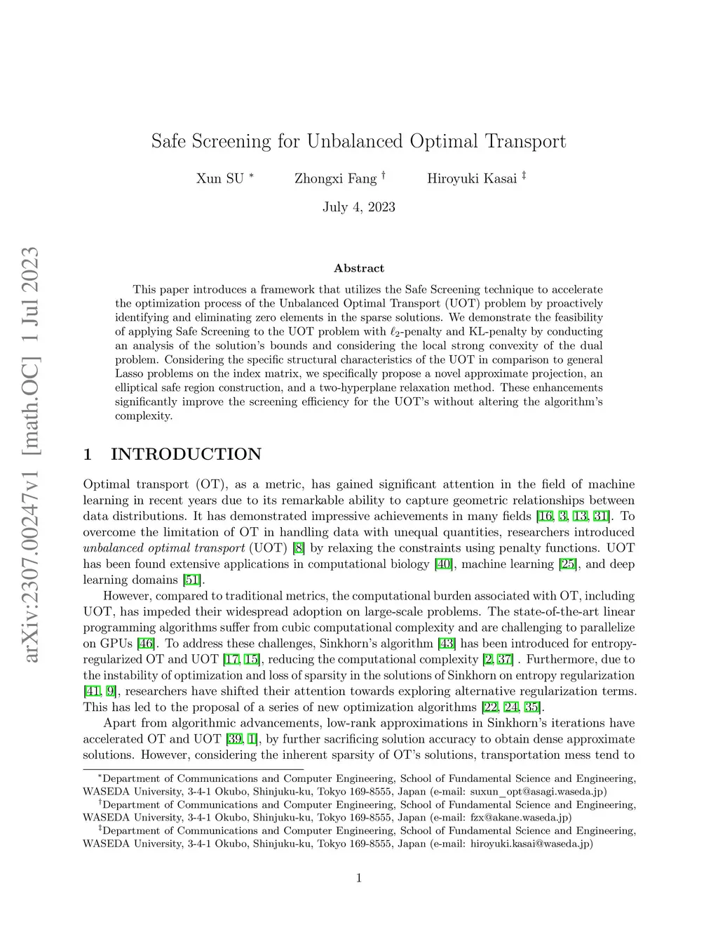 This paper introduces a framework that utilizes the Safe Screening technique to accelerate the optimization process of the Unbalanced Optimal Transport (UOT) problem by proactively identifying and eliminating zero elements in the sparse solutions. We demonstrate the feasibility of applying Safe Screening to the UOT problem with -penalty and KL-penalty by conducting an analysis of the solution's bounds and considering the local strong convexity of the dual problem. Considering the specific structural characteristics of the UOT in comparison to general Lasso problems on the index matrix, we specifically propose a novel approximate projection, an elliptical safe region construction, and a two-hyperplane relaxation method. These enhancements significantly improve the screening efficiency for the UOT's without altering the algorithm's complexity.