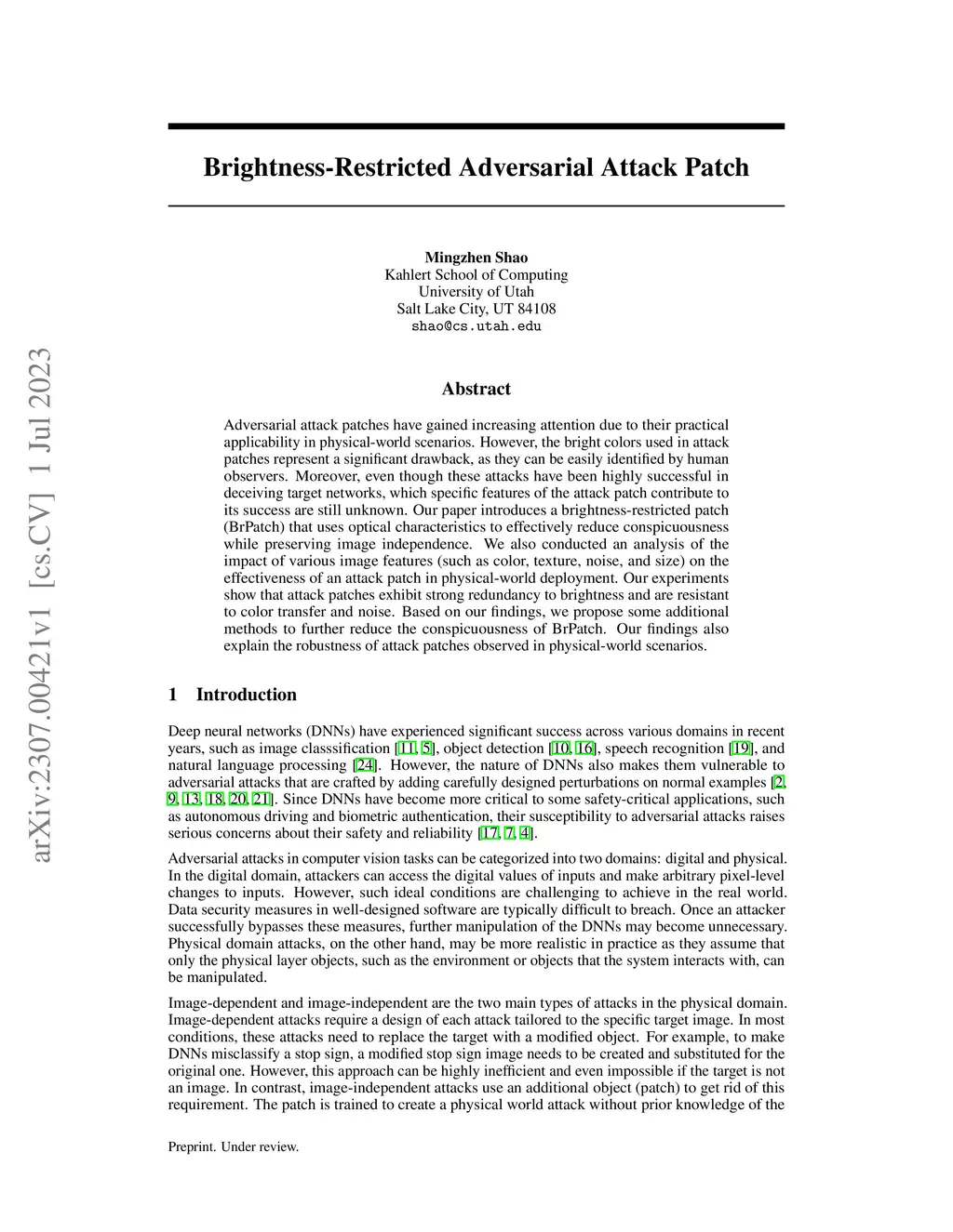 Adversarial attack patches have gained increasing attention due to their practical applicability in physical-world scenarios. However, the bright colors used in attack patches represent a significant drawback, as they can be easily identified by human observers. Moreover, even though these attacks have been highly successful in deceiving target networks, which specific features of the attack patch contribute to its success are still unknown. Our paper introduces a brightness-restricted patch (BrPatch) that uses optical characteristics to effectively reduce conspicuousness while preserving image independence. We also conducted an analysis of the impact of various image features (such as color, texture, noise, and size) on the effectiveness of an attack patch in physical-world deployment. Our experiments show that attack patches exhibit strong redundancy to brightness and are resistant to color transfer and noise. Based on our findings, we propose some additional methods to further reduce the conspicuousness of BrPatch. Our findings also explain the robustness of attack patches observed in physical-world scenarios.
