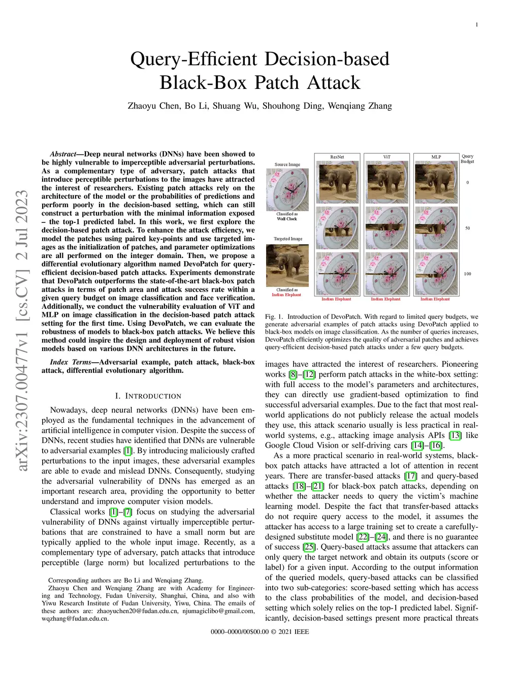Deep neural networks (DNNs) have been showed to be highly vulnerable to imperceptible adversarial perturbations. As a complementary type of adversary, patch attacks that introduce perceptible perturbations to the images have attracted the interest of researchers. Existing patch attacks rely on the architecture of the model or the probabilities of predictions and perform poorly in the decision-based setting, which can still construct a perturbation with the minimal information exposed -- the top-1 predicted label. In this work, we first explore the decision-based patch attack. To enhance the attack efficiency, we model the patches using paired key-points and use targeted images as the initialization of patches, and parameter optimizations are all performed on the integer domain. Then, we propose a differential evolutionary algorithm named DevoPatch for query-efficient decision-based patch attacks. Experiments demonstrate that DevoPatch outperforms the state-of-the-art black-box patch attacks in terms of patch area and attack success rate within a given query budget on image classification and face verification. Additionally, we conduct the vulnerability evaluation of ViT and MLP on image classification in the decision-based patch attack setting for the first time. Using DevoPatch, we can evaluate the robustness of models to black-box patch attacks. We believe this method could inspire the design and deployment of robust vision models based on various DNN architectures in the future.