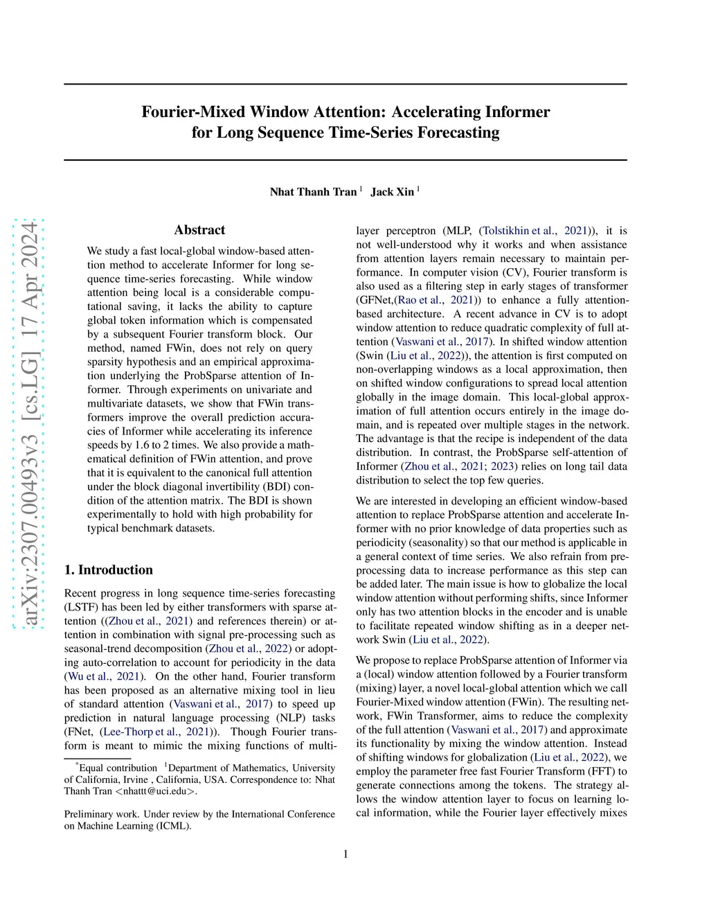 We study a fast local-global window-based attention method to accelerate Informer for long sequence time-series forecasting. While window attention being local is a considerable computational saving, it lacks the ability to capture global token information which is compensated by a subsequent Fourier transform block. Our method, named FWin, does not rely on query sparsity hypothesis and an empirical approximation underlying the ProbSparse attention of Informer. Through experiments on univariate and multivariate datasets, we show that FWin transformers improve the overall prediction accuracies of Informer while accelerating its inference speeds by 1.6 to 2 times. We also provide a mathematical definition of FWin attention, and prove that it is equivalent to the canonical full attention under the block diagonal invertibility (BDI) condition of the attention matrix. The BDI is shown experimentally to hold with high probability for typical benchmark datasets.