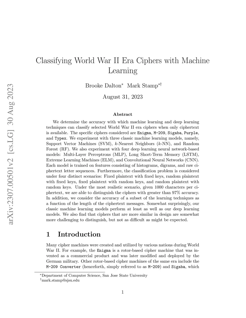 Classifying World War II Era Ciphers with Machine Learning