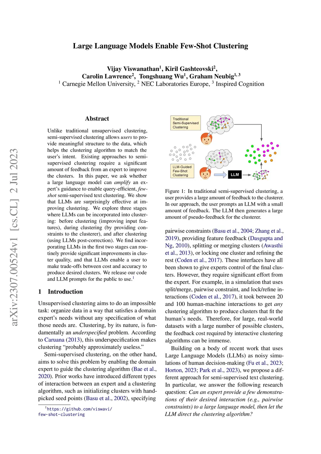 Unlike traditional unsupervised clustering, semi-supervised clustering allows users to provide meaningful structure to the data, which helps the clustering algorithm to match the user's intent. Existing approaches to semi-supervised clustering require a significant amount of feedback from an expert to improve the clusters. In this paper, we ask whether a large language model can amplify an expert's guidance to enable query-efficient, few-shot semi-supervised text clustering. We show that LLMs are surprisingly effective at improving clustering. We explore three stages where LLMs can be incorporated into clustering: before clustering (improving input features), during clustering (by providing constraints to the clusterer), and after clustering (using LLMs post-correction). We find incorporating LLMs in the first two stages can routinely provide significant improvements in cluster quality, and that LLMs enable a user to make trade-offs between cost and accuracy to produce desired clusters. We release our code and LLM prompts for the public to use.