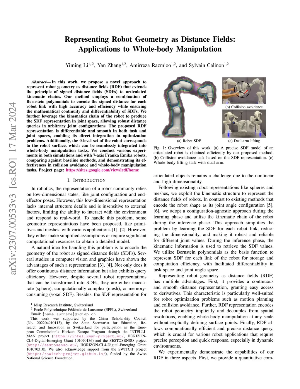In this work, we propose a novel approach to represent robot geometry as distance fields (RDF) that extends the principle of signed distance fields (SDFs) to articulated kinematic chains. Our method employs a combination of Bernstein polynomials to encode the signed distance for each robot link with high accuracy and efficiency while ensuring the mathematical continuity and differentiability of SDFs. We further leverage the kinematics chain of the robot to produce the SDF representation in joint space, allowing robust distance queries in arbitrary joint configurations. The proposed RDF representation is differentiable and smooth in both task and joint spaces, enabling its direct integration to optimization problems. Additionally, the 0-level set of the robot corresponds to the robot surface, which can be seamlessly integrated into whole-body manipulation tasks. We conduct various experiments in both simulations and with 7-axis Franka Emika robots, comparing against baseline methods, and demonstrating its effectiveness in collision avoidance and whole-body manipulation tasks. Project page: https://sites.google.com/view/lrdf/home