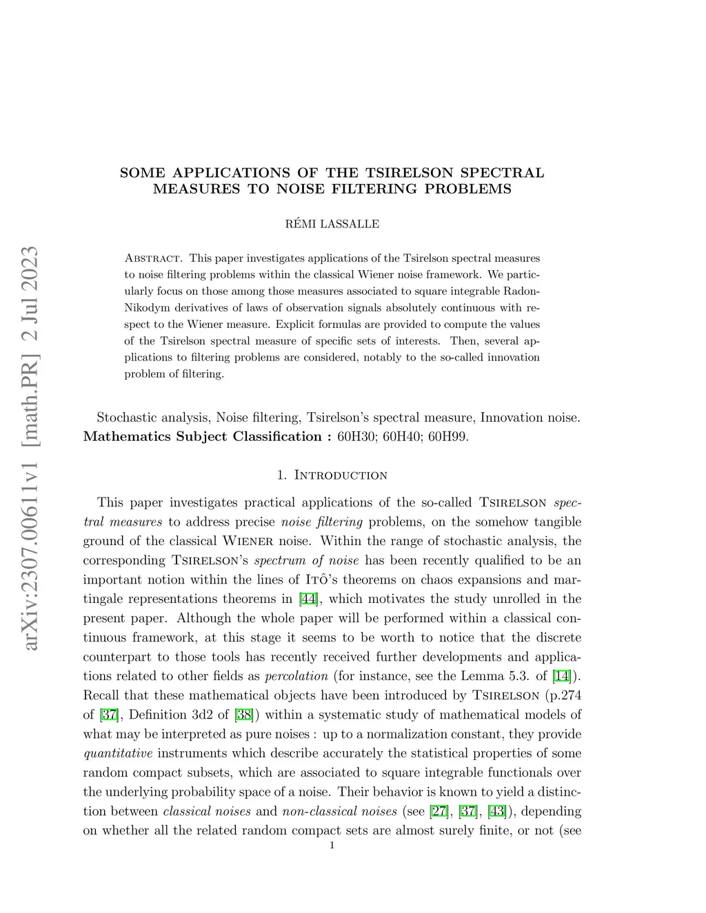 This paper investigates applications of the Tsirelson spectral measures to noise filtering problems within the classical Wiener noise framework. We particularly focus on those among those measures associated to square integrable Radon-Nikodym derivatives of laws of observation signals absolutely continuous with respect to the Wiener measure. Explicit formulas are provided to compute the values of the Tsirelson spectral measure of specific sets of interests. Then, several applications to filtering problems are considered, notably to the so-called innovation problem of filtering.