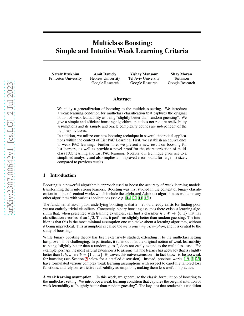 We study a generalization of boosting to the multiclass setting. We introduce a weak learning condition for multiclass classification that captures the original notion of weak learnability as being "slightly better than random guessing". We give a simple and efficient boosting algorithm, that does not require realizability assumptions and its sample and oracle complexity bounds are independent of the number of classes. In addition, we utilize our new boosting technique in several theoretical applications within the context of List PAC Learning. First, we establish an equivalence to weak PAC learning. Furthermore, we present a new result on boosting for list learners, as well as provide a novel proof for the characterization of multiclass PAC learning and List PAC learning. Notably, our technique gives rise to a simplified analysis, and also implies an improved error bound for large list sizes, compared to previous results.