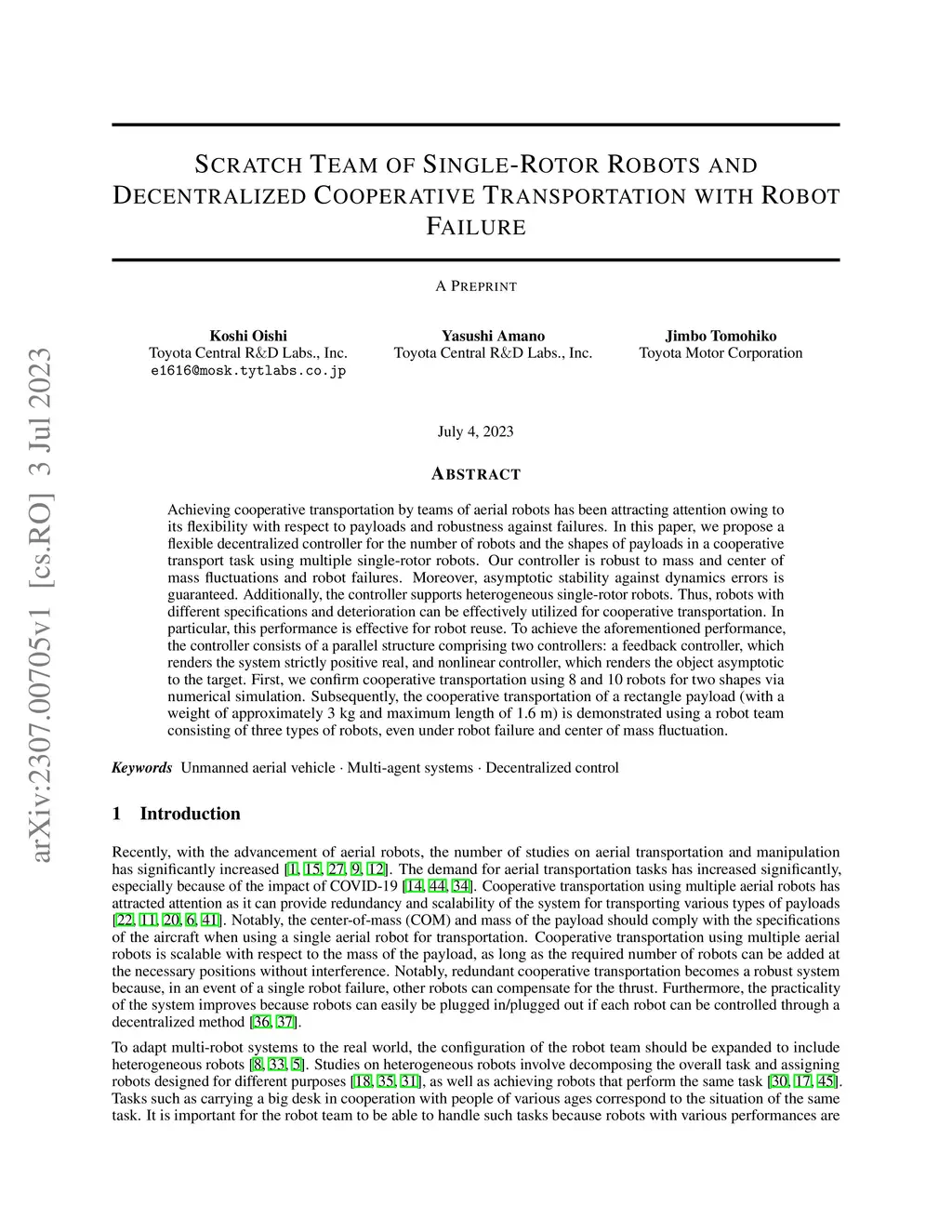 Scratch Team of Single-Rotor Robots and Decentralized Cooperative Transportation with Robot Failure
