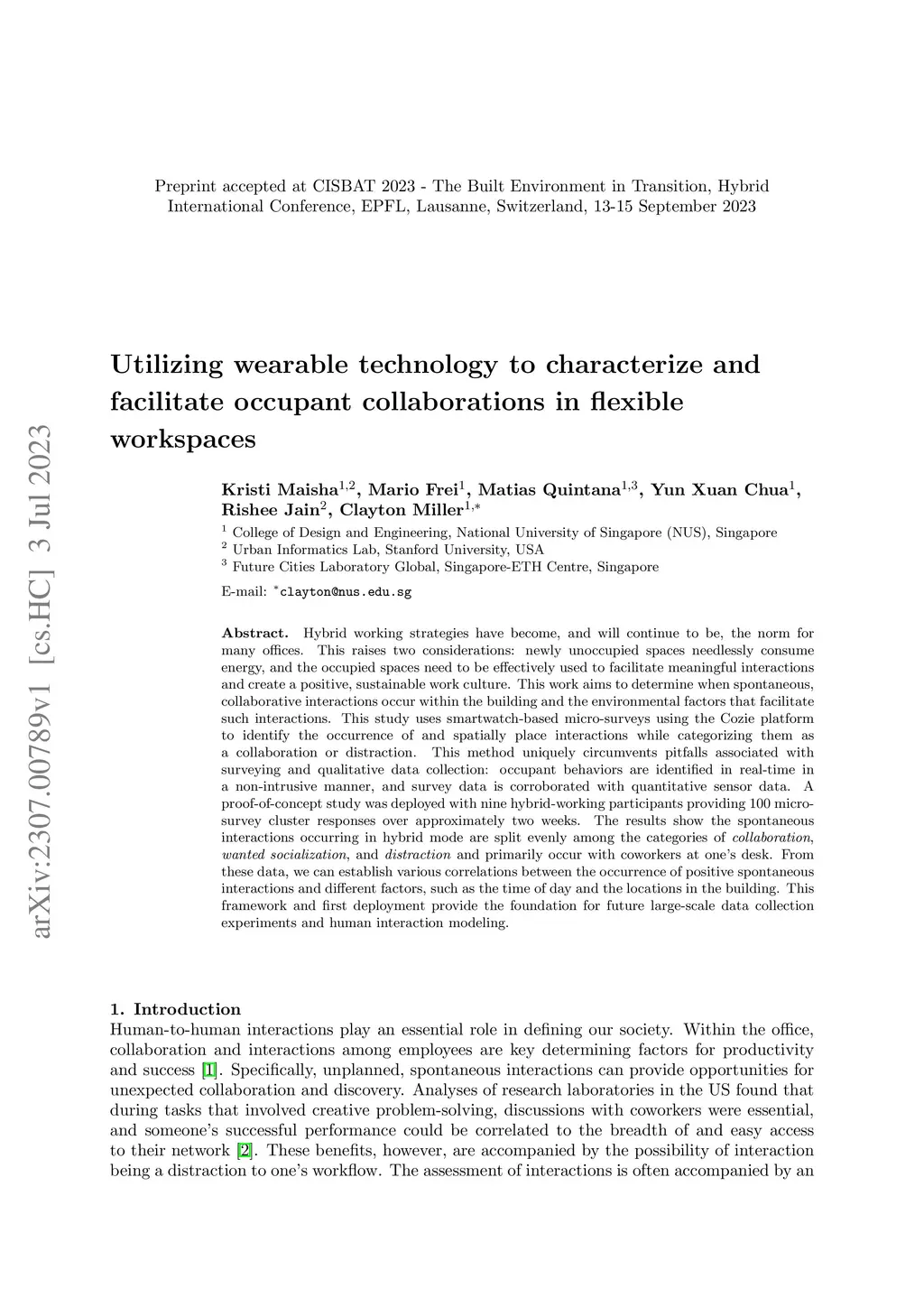 Hybrid working strategies have become, and will continue to be, the norm for many offices. This raises two considerations: newly unoccupied spaces needlessly consume energy, and the occupied spaces need to be effectively used to facilitate meaningful interactions and create a positive, sustainable work culture. This work aims to determine when spontaneous, collaborative interactions occur within the building and the environmental factors that facilitate such interactions. This study uses smartwatch-based micro-surveys using the Cozie platform to identify the occurrence of and spatially place interactions while categorizing them as a collaboration or distraction. This method uniquely circumvents pitfalls associated with surveying and qualitative data collection: occupant behaviors are identified in real-time in a non-intrusive manner, and survey data is corroborated with quantitative sensor data. A proof-of-concept study was deployed with nine hybrid-working participants providing 100 micro-survey cluster responses over approximately two weeks. The results show the spontaneous interactions occurring in hybrid mode are split evenly among the categories of collaboration, wanted socialization, and distraction and primarily occur with coworkers at one's desk. From these data, we can establish various correlations between the occurrence of positive spontaneous interactions and different factors, such as the time of day and the locations in the building. This framework and first deployment provide the foundation for future large-scale data collection experiments and human interaction modeling.