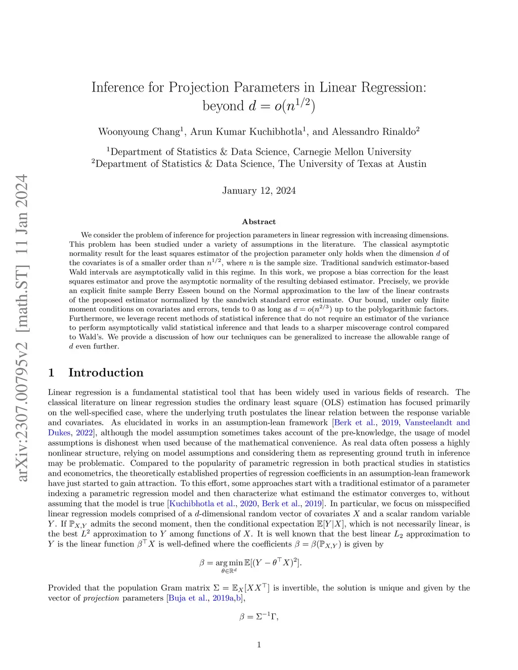 We consider the problem of inference for projection parameters in linear regression with increasing dimensions. This problem has been studied under a variety of assumptions in the literature. The classical asymptotic normality result for the least squares estimator of the projection parameter only holds when the dimension of the covariates is of smaller order than , where is the sample size. Traditional sandwich estimator-based Wald intervals are asymptotically valid in this regime. In this work, we propose a bias correction for the least squares estimator and prove the asymptotic normality of the resulting debiased estimator as long as , with an explicit bound on the rate of convergence to normality. We leverage recent methods of statistical inference that do not require an estimator of the variance to perform asymptotically valid statistical inference. We provide a discussion of how our techniques can be generalized to increase the allowable range of even further.
