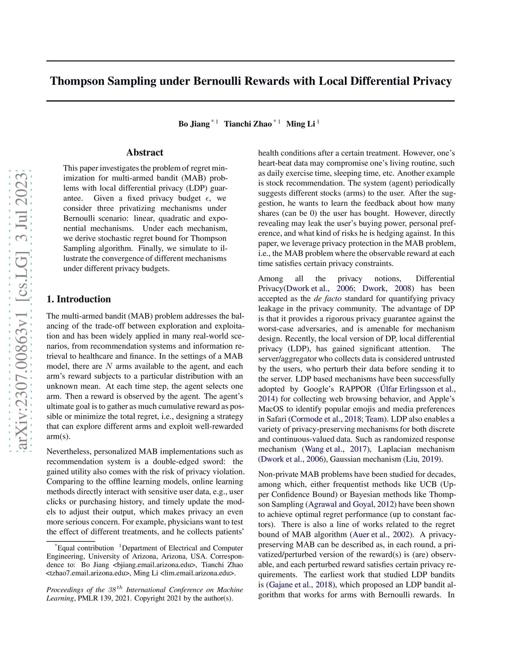 This paper investigates the problem of regret minimization for multi-armed bandit (MAB) problems with local differential privacy (LDP) guarantee. Given a fixed privacy budget , we consider three privatizing mechanisms under Bernoulli scenario: linear, quadratic and exponential mechanisms. Under each mechanism, we derive stochastic regret bound for Thompson Sampling algorithm. Finally, we simulate to illustrate the convergence of different mechanisms under different privacy budgets.