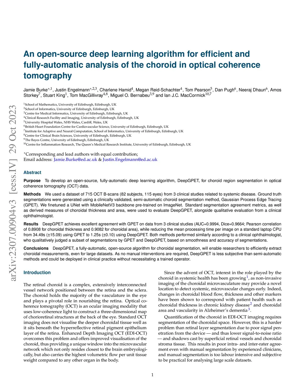 Purpose: To develop an open-source, fully-automatic deep learning algorithm, DeepGPET, for choroid region segmentation in optical coherence tomography (OCT) data. Methods: We used a dataset of 715 OCT B-scans (82 subjects, 115 eyes) from 3 clinical studies related to systemic disease. Ground truth segmentations were generated using a clinically validated, semi-automatic choroid segmentation method, Gaussian Process Edge Tracing (GPET). We finetuned a UNet with MobileNetV3 backbone pre-trained on ImageNet. Standard segmentation agreement metrics, as well as derived measures of choroidal thickness and area, were used to evaluate DeepGPET, alongside qualitative evaluation from a clinical ophthalmologist. Results: DeepGPET achieves excellent agreement with GPET on data from 3 clinical studies (AUC=0.9994, Dice=0.9664; Pearson correlation of 0.8908 for choroidal thickness and 0.9082 for choroidal area), while reducing the mean processing time per image on a standard laptop CPU from 34.49s (15.09) using GPET to 1.25s (0.10) using DeepGPET. Both methods performed similarly according to a clinical ophthalmologist, who qualitatively judged a subset of segmentations by GPET and DeepGPET, based on smoothness and accuracy of segmentations. Conclusions: DeepGPET, a fully-automatic, open-source algorithm for choroidal segmentation, will enable researchers to efficiently extract choroidal measurements, even for large datasets. As no manual interventions are required, DeepGPET is less subjective than semi-automatic methods and could be deployed in clinical practice without necessitating a trained operator.