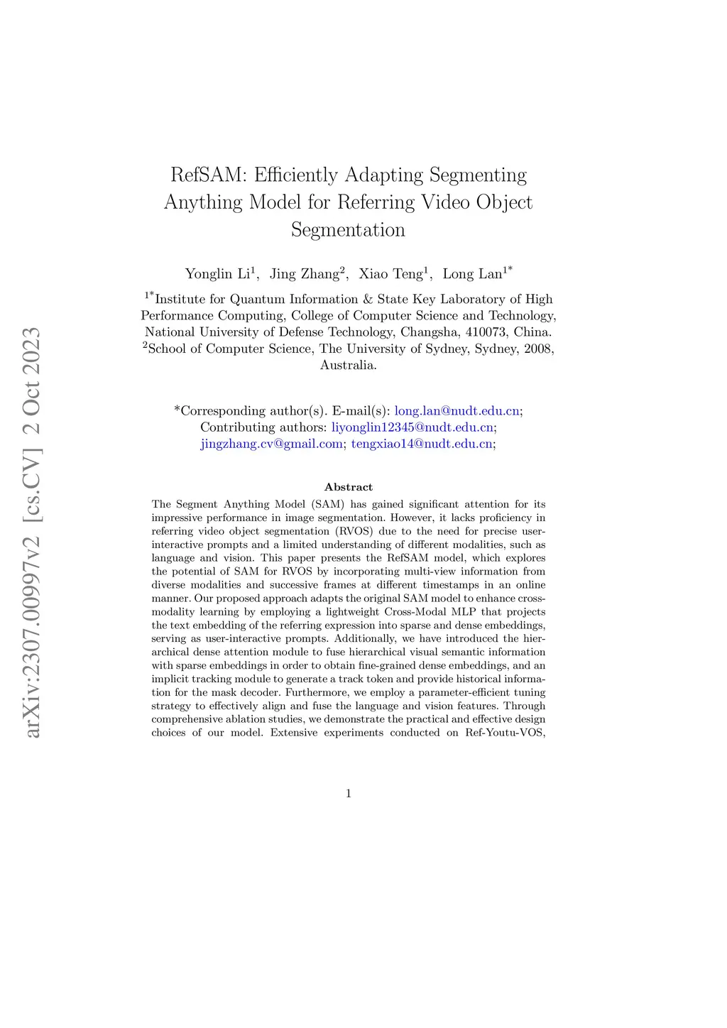 The Segment Anything Model (SAM) has gained significant attention for its impressive performance in image segmentation. However, it lacks proficiency in referring video object segmentation (RVOS) due to the need for precise user-interactive prompts and a limited understanding of different modalities, such as language and vision. This paper presents the RefSAM model, which explores the potential of SAM for RVOS by incorporating multi-view information from diverse modalities and successive frames at different timestamps in an online manner. Our proposed approach adapts the original SAM model to enhance cross-modality learning by employing a lightweight Cross-Modal MLP that projects the text embedding of the referring expression into sparse and dense embeddings, serving as user-interactive prompts. Additionally, we have introduced the hierarchical dense attention module to fuse hierarchical visual semantic information with sparse embeddings in order to obtain fine-grained dense embeddings, and an implicit tracking module to generate a track token and provide historical information for the mask decoder. Furthermore, we employ a parameter-efficient tuning strategy to effectively align and fuse the language and vision features. Through comprehensive ablation studies, we demonstrate the practical and effective design choices of our model. Extensive experiments conducted on Ref-Youtu-VOS, Ref-DAVIS17, and three referring image segmentation datasets validate the superiority and effectiveness of our RefSAM model over existing methods. The code and models will be made publicly at \href{https://github.com/LancasterLi/RefSAM}{github.com/LancasterLi/RefSAM}.