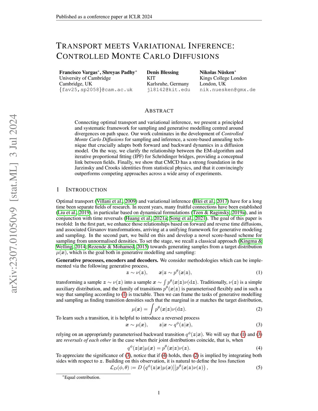 Connecting optimal transport and variational inference, we present a principled and systematic framework for sampling and generative modelling centred around divergences on path space. Our work culminates in the development of the \emph{Controlled Monte Carlo Diffusion} sampler (CMCD) for Bayesian computation, a score-based annealing technique that crucially adapts both forward and backward dynamics in a diffusion model. On the way, we clarify the relationship between the EM-algorithm and iterative proportional fitting (IPF) for Schr{\"o}dinger bridges, deriving as well a regularised objective that bypasses the iterative bottleneck of standard IPF-updates. Finally, we show that CMCD has a strong foundation in the Jarzinsky and Crooks identities from statistical physics, and that it convincingly outperforms competing approaches across a wide array of experiments.