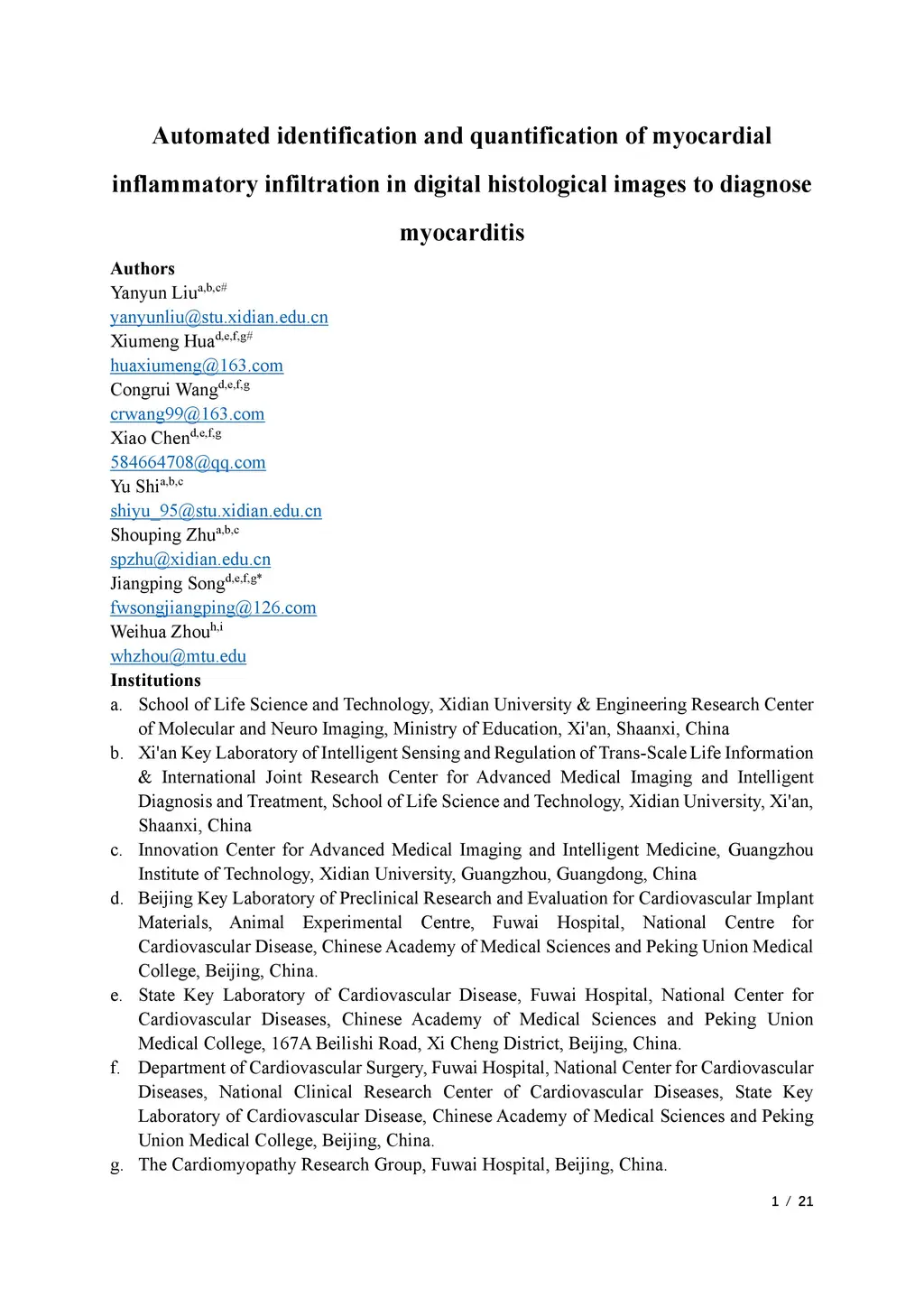 infiltration in digital histological images to diagnose myocarditis