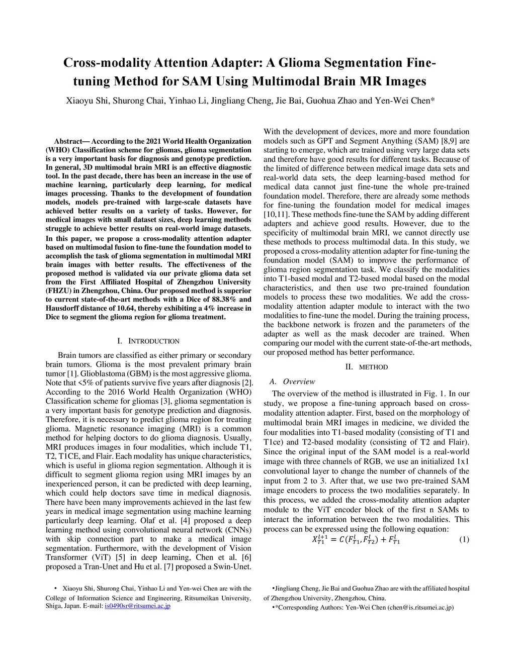 According to the 2021 World Health Organization (WHO) Classification scheme for gliomas, glioma segmentation is a very important basis for diagnosis and genotype prediction. In general, 3D multimodal brain MRI is an effective diagnostic tool. In the past decade, there has been an increase in the use of machine learning, particularly deep learning, for medical images processing. Thanks to the development of foundation models, models pre-trained with large-scale datasets have achieved better results on a variety of tasks. However, for medical images with small dataset sizes, deep learning methods struggle to achieve better results on real-world image datasets. In this paper, we propose a cross-modality attention adapter based on multimodal fusion to fine-tune the foundation model to accomplish the task of glioma segmentation in multimodal MRI brain images with better results. The effectiveness of the proposed method is validated via our private glioma data set from the First Affiliated Hospital of Zhengzhou University (FHZU) in Zhengzhou, China. Our proposed method is superior to current state-of-the-art methods with a Dice of 88.38% and Hausdorff distance of 10.64, thereby exhibiting a 4% increase in Dice to segment the glioma region for glioma treatment.