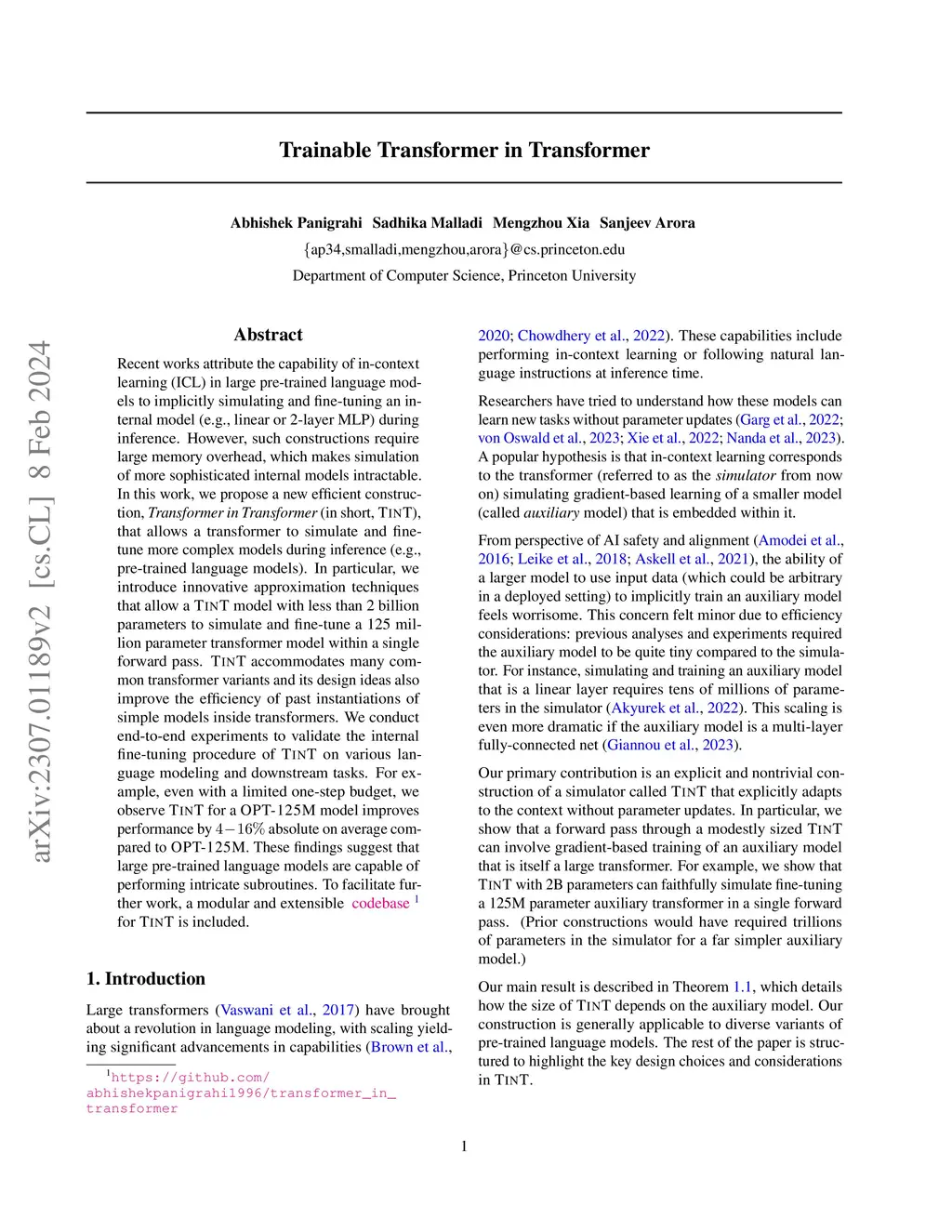 Recent works attribute the capability of in-context learning (ICL) in large pre-trained language models to implicitly simulating and fine-tuning an internal model (e.g., linear or 2-layer MLP) during inference. However, such constructions require large memory overhead, which makes simulation of more sophisticated internal models intractable. In this work, we propose an efficient construction, Transformer in Transformer (in short, TinT), that allows a transformer to simulate and fine-tune complex models internally during inference (e.g., pre-trained language models). In particular, we introduce innovative approximation techniques that allow a TinT model with less than 2 billion parameters to simulate and fine-tune a 125 million parameter transformer model within a single forward pass. TinT accommodates many common transformer variants and its design ideas also improve the efficiency of past instantiations of simple models inside transformers. We conduct end-to-end experiments to validate the internal fine-tuning procedure of TinT on various language modeling and downstream tasks. For example, even with a limited one-step budget, we observe TinT for a OPT-125M model improves performance by 4-16% absolute on average compared to OPT-125M. These findings suggest that large pre-trained language models are capable of performing intricate subroutines. To facilitate further work, a modular and extensible codebase for TinT is included.
