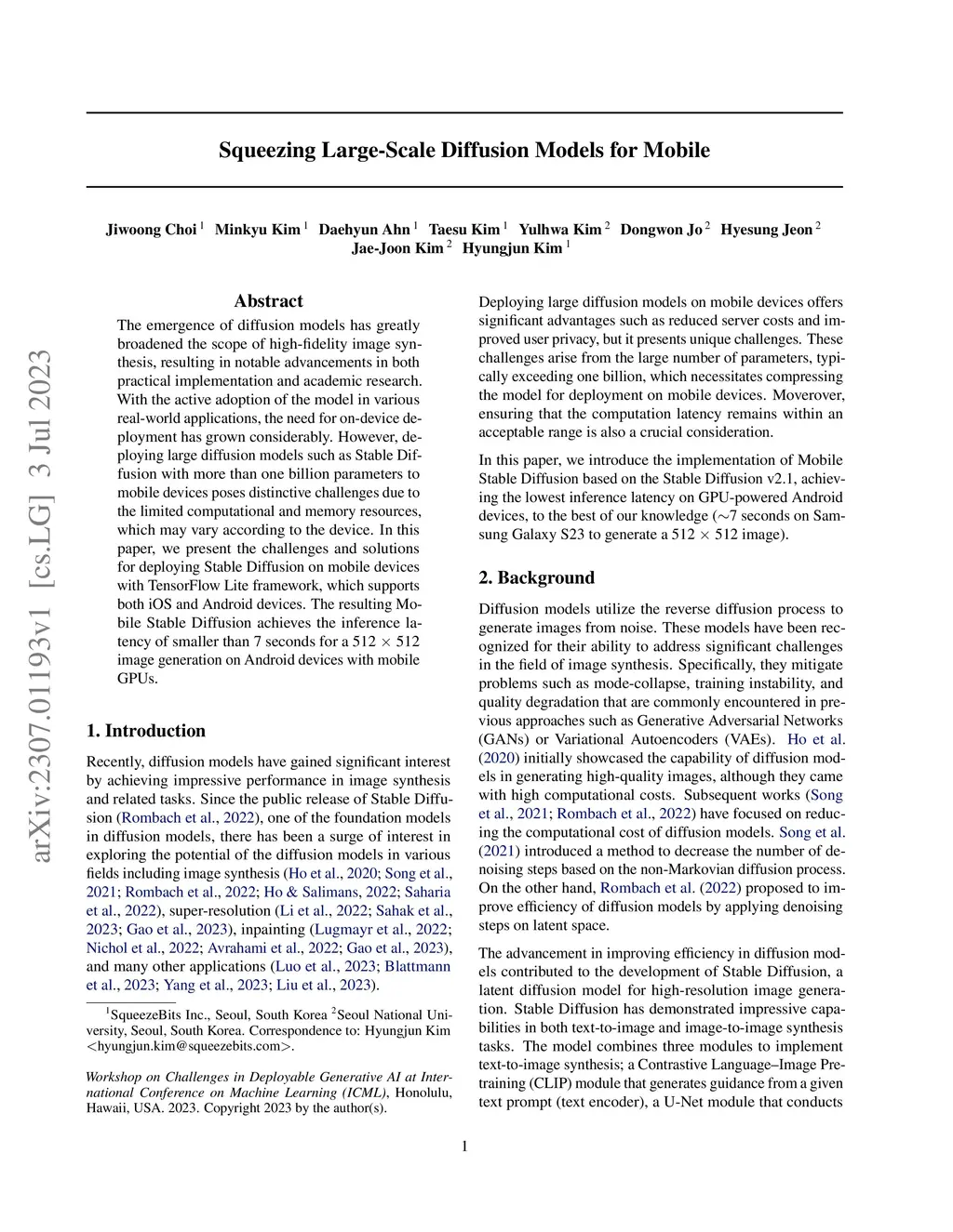The emergence of diffusion models has greatly broadened the scope of high-fidelity image synthesis, resulting in notable advancements in both practical implementation and academic research. With the active adoption of the model in various real-world applications, the need for on-device deployment has grown considerably. However, deploying large diffusion models such as Stable Diffusion with more than one billion parameters to mobile devices poses distinctive challenges due to the limited computational and memory resources, which may vary according to the device. In this paper, we present the challenges and solutions for deploying Stable Diffusion on mobile devices with TensorFlow Lite framework, which supports both iOS and Android devices. The resulting Mobile Stable Diffusion achieves the inference latency of smaller than 7 seconds for a 512x512 image generation on Android devices with mobile GPUs.