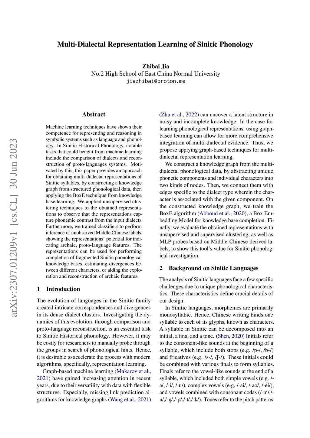 Machine learning techniques have shown their competence for representing and reasoning in symbolic systems such as language and phonology. In Sinitic Historical Phonology, notable tasks that could benefit from machine learning include the comparison of dialects and reconstruction of proto-languages systems. Motivated by this, this paper provides an approach for obtaining multi-dialectal representations of Sinitic syllables, by constructing a knowledge graph from structured phonological data, then applying the BoxE technique from knowledge base learning. We applied unsupervised clustering techniques to the obtained representations to observe that the representations capture phonemic contrast from the input dialects. Furthermore, we trained classifiers to perform inference of unobserved Middle Chinese labels, showing the representations' potential for indicating archaic, proto-language features. The representations can be used for performing completion of fragmented Sinitic phonological knowledge bases, estimating divergences between different characters, or aiding the exploration and reconstruction of archaic features.