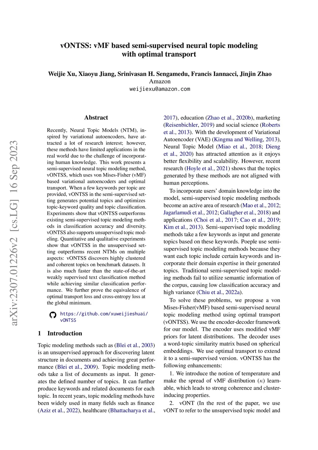 vONTSS: vMF based semi-supervised neural topic modeling with optimal