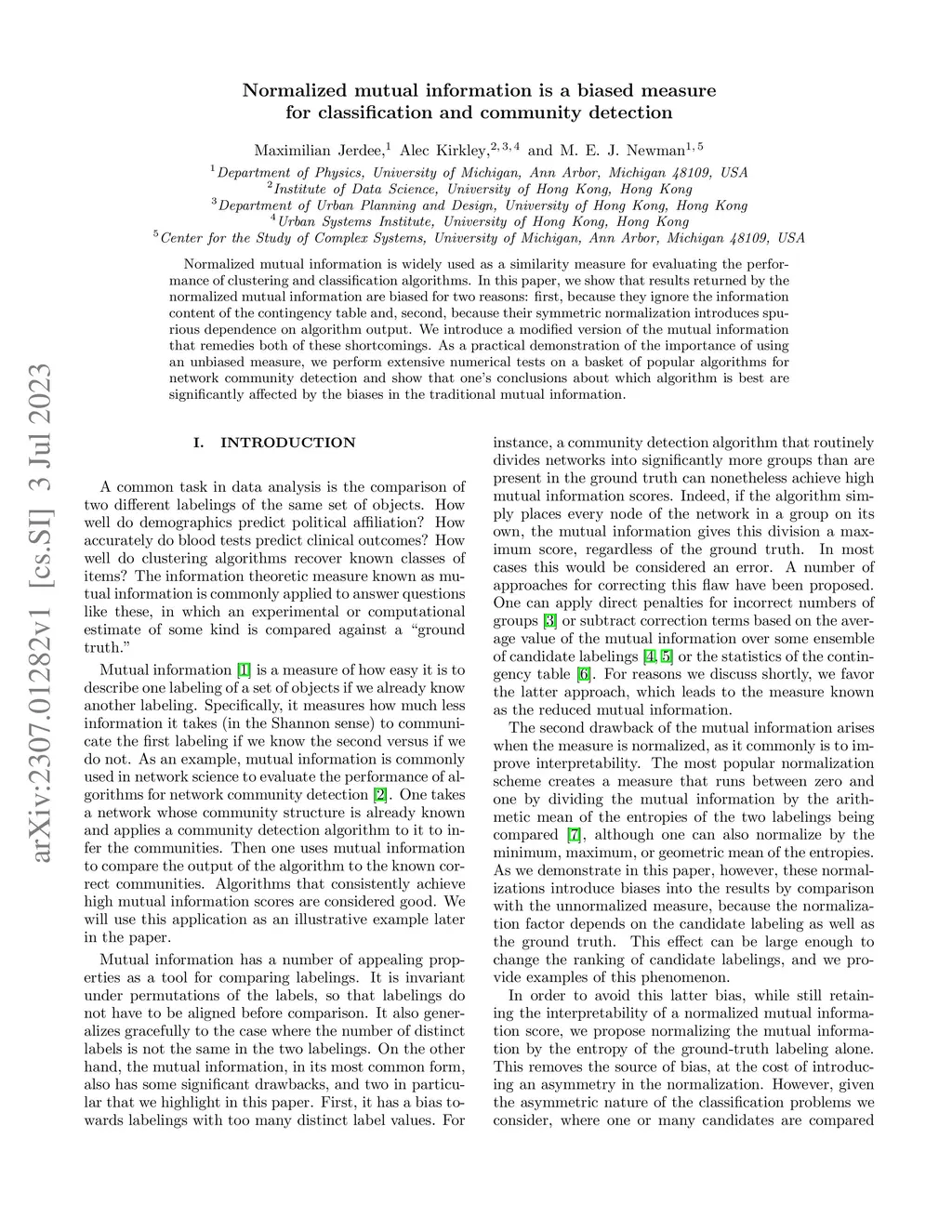 Normalized mutual information is widely used as a similarity measure for evaluating the performance of clustering and classification algorithms. In this paper, we argue that results returned by the normalized mutual information are biased for two reasons: first, because they ignore the information content of the contingency table and, second, because their symmetric normalization introduces spurious dependence on algorithm output. We introduce a modified version of the mutual information that remedies both of these shortcomings. As a practical demonstration of the importance of using an unbiased measure, we perform extensive numerical tests on a basket of popular algorithms for network community detection and show that one's conclusions about which algorithm is best are significantly affected by the biases in the traditional mutual information.