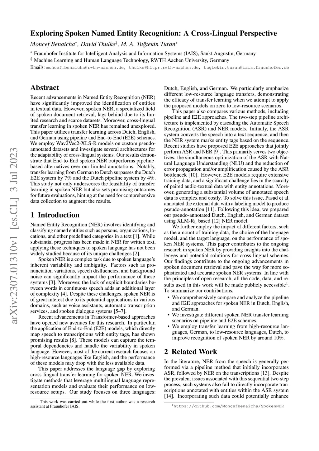 Recent advancements in Named Entity Recognition (NER) have significantly improved the identification of entities in textual data. However, spoken NER, a specialized field of spoken document retrieval, lags behind due to its limited research and scarce datasets. Moreover, cross-lingual transfer learning in spoken NER has remained unexplored. This paper utilizes transfer learning across Dutch, English, and German using pipeline and End-to-End (E2E) schemes. We employ Wav2Vec2-XLS-R models on custom pseudo-annotated datasets and investigate several architectures for the adaptability of cross-lingual systems. Our results demonstrate that End-to-End spoken NER outperforms pipeline-based alternatives over our limited annotations. Notably, transfer learning from German to Dutch surpasses the Dutch E2E system by 7% and the Dutch pipeline system by 4%. This study not only underscores the feasibility of transfer learning in spoken NER but also sets promising outcomes for future evaluations, hinting at the need for comprehensive data collection to augment the results.