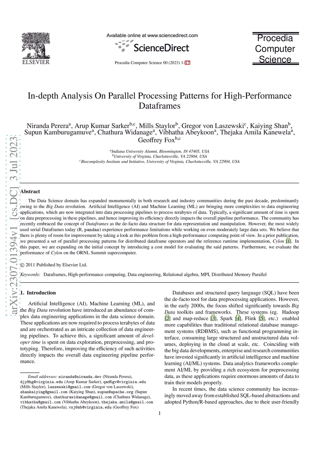 The Data Science domain has expanded monumentally in both research and industry communities during the past decade, predominantly owing to the Big Data revolution. Artificial Intelligence (AI) and Machine Learning (ML) are bringing more complexities to data engineering applications, which are now integrated into data processing pipelines to process terabytes of data. Typically, a significant amount of time is spent on data preprocessing in these pipelines, and hence improving its e fficiency directly impacts the overall pipeline performance. The community has recently embraced the concept of Dataframes as the de-facto data structure for data representation and manipulation. However, the most widely used serial Dataframes today (R, pandas) experience performance limitations while working on even moderately large data sets. We believe that there is plenty of room for improvement by taking a look at this problem from a high-performance computing point of view. In a prior publication, we presented a set of parallel processing patterns for distributed dataframe operators and the reference runtime implementation, Cylon [1]. In this paper, we are expanding on the initial concept by introducing a cost model for evaluating the said patterns. Furthermore, we evaluate the performance of Cylon on the ORNL Summit supercomputer.