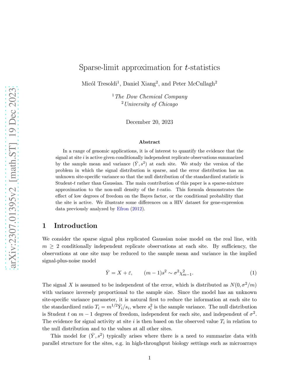 In a range of genomic applications, it is of interest to quantify the evidence that the signal at site~ is active given conditionally independent replicate observations summarized by the sample mean and variance at each site. We study the version of the problem in which the signal distribution is sparse, and the error distribution has an unknown site-specific variance so that the null distribution of the standardized statistic is Student- rather than Gaussian. The main contribution of this paper is a sparse-mixture approximation to the non-null density of the -ratio. This formula demonstrates the effect of low degrees of freedom on the Bayes factor, or the conditional probability that the site is active. We illustrate some differences on a HIV dataset for gene-expression data previously analyzed by Efron (2012).