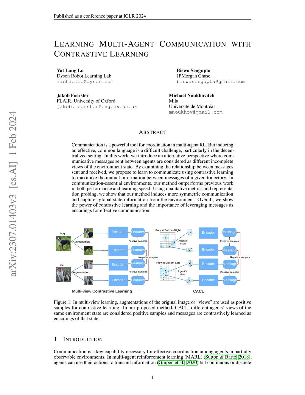 Communication is a powerful tool for coordination in multi-agent RL. But inducing an effective, common language is a difficult challenge, particularly in the decentralized setting. In this work, we introduce an alternative perspective where communicative messages sent between agents are considered as different incomplete views of the environment state. By examining the relationship between messages sent and received, we propose to learn to communicate using contrastive learning to maximize the mutual information between messages of a given trajectory. In communication-essential environments, our method outperforms previous work in both performance and learning speed. Using qualitative metrics and representation probing, we show that our method induces more symmetric communication and captures global state information from the environment. Overall, we show the power of contrastive learning and the importance of leveraging messages as encodings for effective communication.