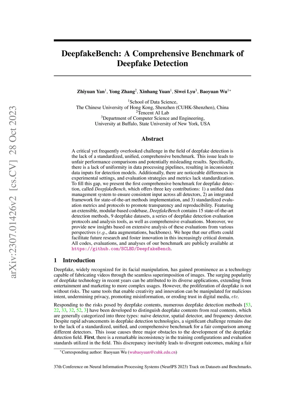 DeepfakeBench: A Comprehensive Benchmark of Deepfake Detection