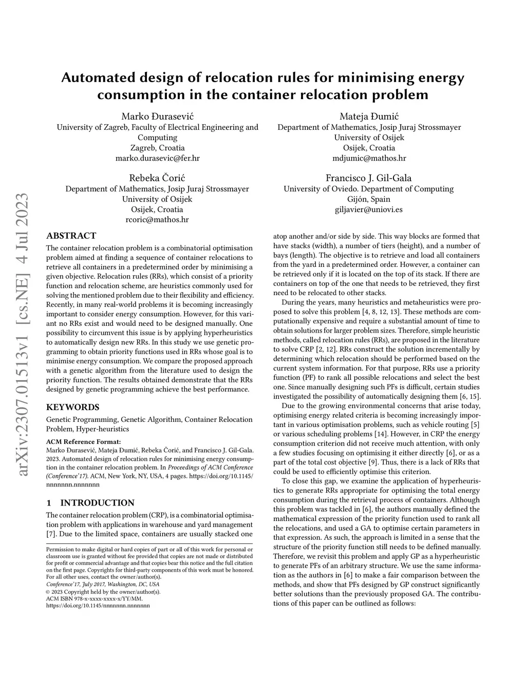 The container relocation problem is a combinatorial optimisation problem aimed at finding a sequence of container relocations to retrieve all containers in a predetermined order by minimising a given objective. Relocation rules (RRs), which consist of a priority function and relocation scheme, are heuristics commonly used for solving the mentioned problem due to their flexibility and efficiency. Recently, in many real-world problems it is becoming increasingly important to consider energy consumption. However, for this variant no RRs exist and would need to be designed manually. One possibility to circumvent this issue is by applying hyperheuristics to automatically design new RRs. In this study we use genetic programming to obtain priority functions used in RRs whose goal is to minimise energy consumption. We compare the proposed approach with a genetic algorithm from the literature used to design the priority function. The results obtained demonstrate that the RRs designed by genetic programming achieve the best performance.