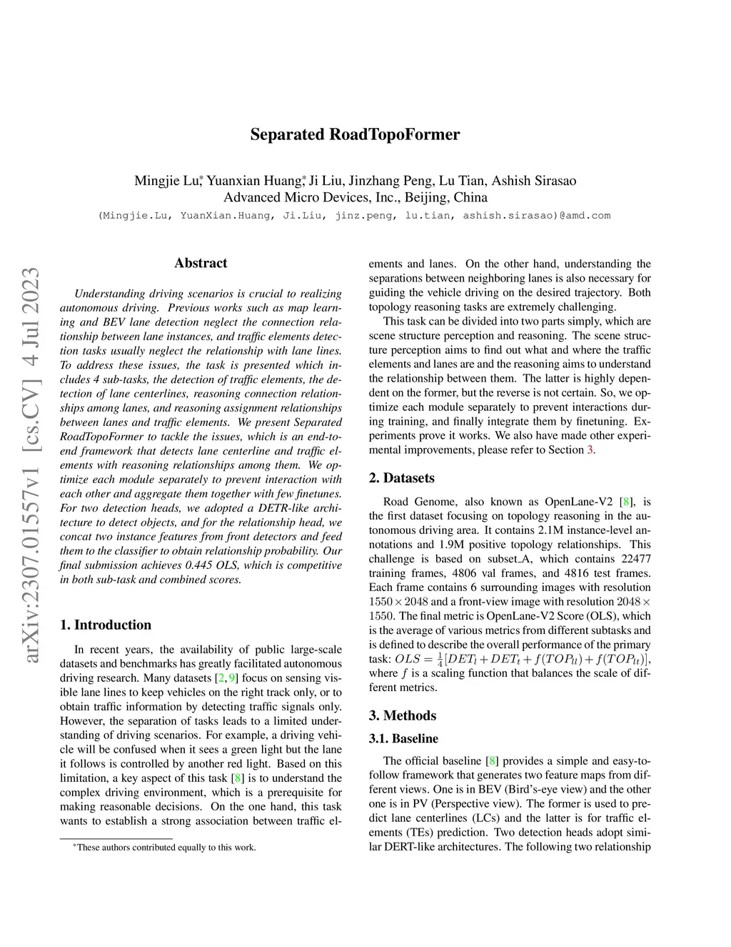 Understanding driving scenarios is crucial to realizing autonomous driving. Previous works such as map learning and BEV lane detection neglect the connection relationship between lane instances, and traffic elements detection tasks usually neglect the relationship with lane lines. To address these issues, the task is presented which includes 4 sub-tasks, the detection of traffic elements, the detection of lane centerlines, reasoning connection relationships among lanes, and reasoning assignment relationships between lanes and traffic elements. We present Separated RoadTopoFormer to tackle the issues, which is an end-to-end framework that detects lane centerline and traffic elements with reasoning relationships among them. We optimize each module separately to prevent interaction with each other and aggregate them together with few finetunes. For two detection heads, we adopted a DETR-like architecture to detect objects, and for the relationship head, we concat two instance features from front detectors and feed them to the classifier to obtain relationship probability. Our final submission achieves 0.445 OLS, which is competitive in both sub-task and combined scores.