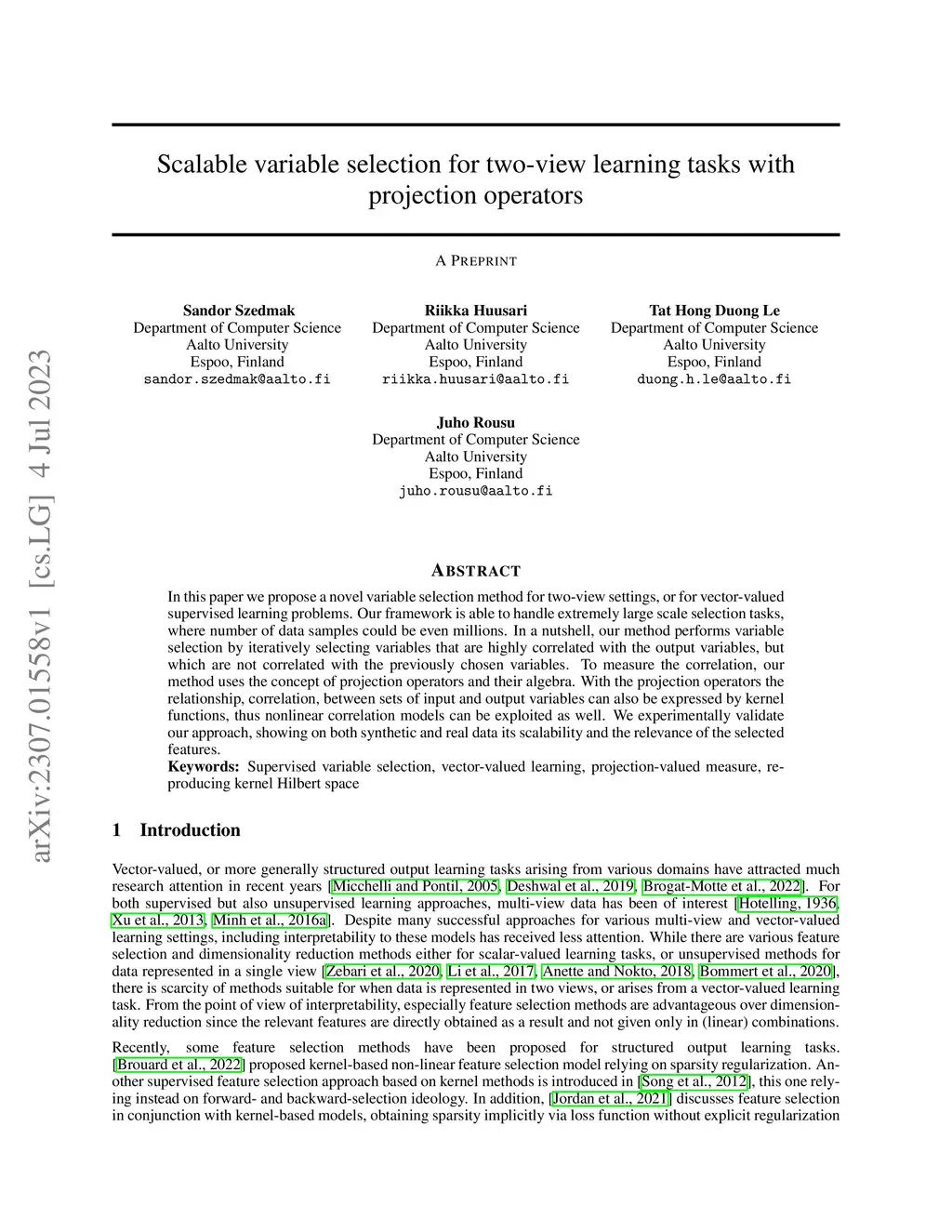 In this paper we propose a novel variable selection method for two-view settings, or for vector-valued supervised learning problems. Our framework is able to handle extremely large scale selection tasks, where number of data samples could be even millions. In a nutshell, our method performs variable selection by iteratively selecting variables that are highly correlated with the output variables, but which are not correlated with the previously chosen variables. To measure the correlation, our method uses the concept of projection operators and their algebra. With the projection operators the relationship, correlation, between sets of input and output variables can also be expressed by kernel functions, thus nonlinear correlation models can be exploited as well. We experimentally validate our approach, showing on both synthetic and real data its scalability and the relevance of the selected features. Keywords: Supervised variable selection, vector-valued learning, projection-valued measure, reproducing kernel Hilbert space
