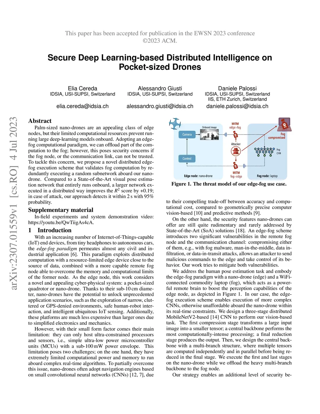 Palm-sized nano-drones are an appealing class of edge nodes, but their limited computational resources prevent running large deep-learning models onboard. Adopting an edge-fog computational paradigm, we can offload part of the computation to the fog; however, this poses security concerns if the fog node, or the communication link, can not be trusted. To tackle this concern, we propose a novel distributed edge-fog execution scheme that validates fog computation by redundantly executing a random subnetwork aboard our nano-drone. Compared to a State-of-the-Art visual pose estimation network that entirely runs onboard, a larger network executed in a distributed way improves the score by +0.19; in case of attack, our approach detects it within 2s with 95% probability.