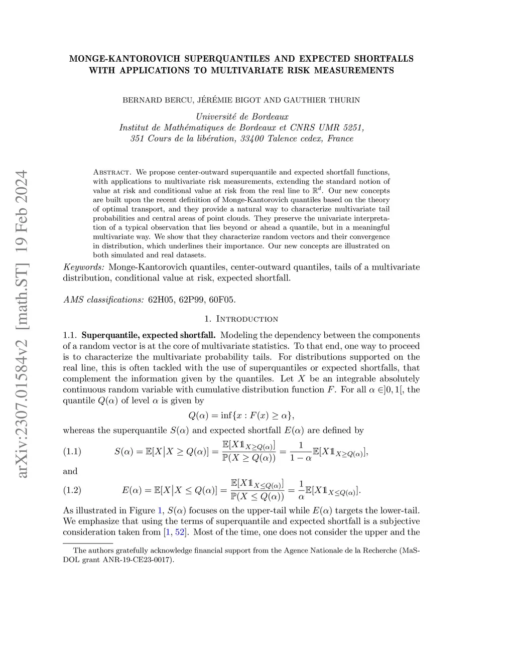 Monge-Kantorovich superquantiles and expected shortfalls with