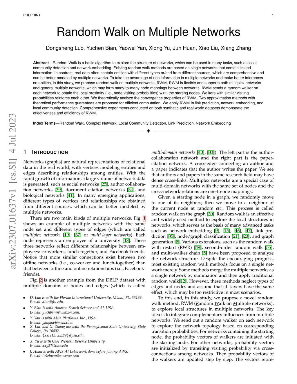 Random Walk is a basic algorithm to explore the structure of networks, which can be used in many tasks, such as local community detection and network embedding. Existing random walk methods are based on single networks that contain limited information. In contrast, real data often contain entities with different types or/and from different sources, which are comprehensive and can be better modeled by multiple networks. To take advantage of rich information in multiple networks and make better inferences on entities, in this study, we propose random walk on multiple networks, RWM. RWM is flexible and supports both multiplex networks and general multiple networks, which may form many-to-many node mappings between networks. RWM sends a random walker on each network to obtain the local proximity (i.e., node visiting probabilities) w.r.t. the starting nodes. Walkers with similar visiting probabilities reinforce each other. We theoretically analyze the convergence properties of RWM. Two approximation methods with theoretical performance guarantees are proposed for efficient computation. We apply RWM in link prediction, network embedding, and local community detection. Comprehensive experiments conducted on both synthetic and real-world datasets demonstrate the effectiveness and efficiency of RWM.
