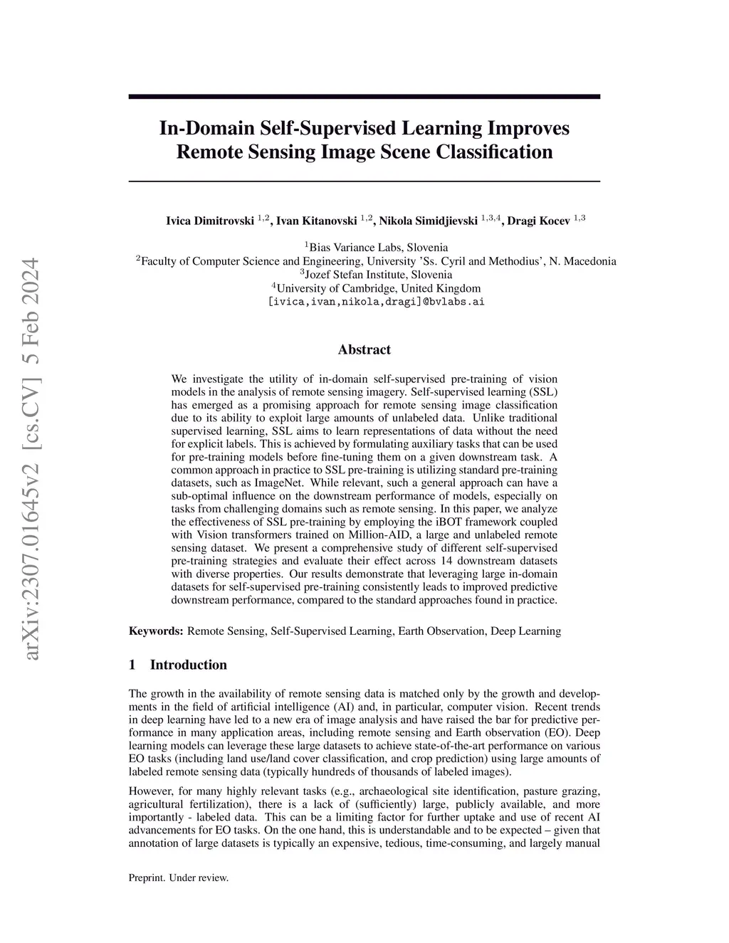 We investigate the utility of in-domain self-supervised pre-training of vision models in the analysis of remote sensing imagery. Self-supervised learning (SSL) has emerged as a promising approach for remote sensing image classification due to its ability to exploit large amounts of unlabeled data. Unlike traditional supervised learning, SSL aims to learn representations of data without the need for explicit labels. This is achieved by formulating auxiliary tasks that can be used for pre-training models before fine-tuning them on a given downstream task. A common approach in practice to SSL pre-training is utilizing standard pre-training datasets, such as ImageNet. While relevant, such a general approach can have a sub-optimal influence on the downstream performance of models, especially on tasks from challenging domains such as remote sensing. In this paper, we analyze the effectiveness of SSL pre-training by employing the iBOT framework coupled with Vision transformers trained on Million-AID, a large and unlabeled remote sensing dataset. We present a comprehensive study of different self-supervised pre-training strategies and evaluate their effect across 14 downstream datasets with diverse properties. Our results demonstrate that leveraging large in-domain datasets for self-supervised pre-training consistently leads to improved predictive downstream performance, compared to the standard approaches found in practice.