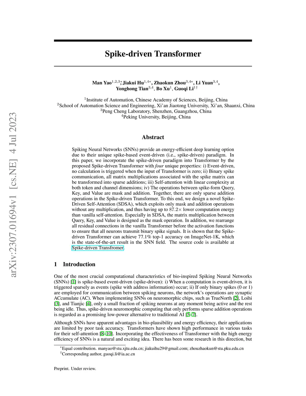 Spiking Neural Networks (SNNs) provide an energy-efficient deep learning option due to their unique spike-based event-driven (i.e., spike-driven) paradigm. In this paper, we incorporate the spike-driven paradigm into Transformer by the proposed Spike-driven Transformer with four unique properties: 1) Event-driven, no calculation is triggered when the input of Transformer is zero; 2) Binary spike communication, all matrix multiplications associated with the spike matrix can be transformed into sparse additions; 3) Self-attention with linear complexity at both token and channel dimensions; 4) The operations between spike-form Query, Key, and Value are mask and addition. Together, there are only sparse addition operations in the Spike-driven Transformer. To this end, we design a novel Spike-Driven Self-Attention (SDSA), which exploits only mask and addition operations without any multiplication, and thus having up to lower computation energy than vanilla self-attention. Especially in SDSA, the matrix multiplication between Query, Key, and Value is designed as the mask operation. In addition, we rearrange all residual connections in the vanilla Transformer before the activation functions to ensure that all neurons transmit binary spike signals. It is shown that the Spike-driven Transformer can achieve 77.1\% top-1 accuracy on ImageNet-1K, which is the state-of-the-art result in the SNN field. The source code is available at https://github.com/BICLab/Spike-Driven-Transformer.