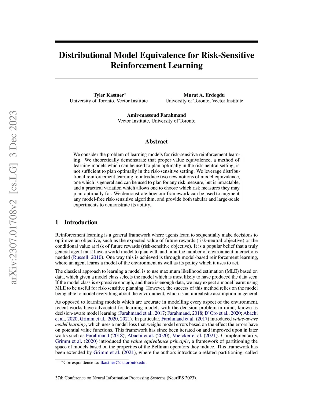 We consider the problem of learning models for risk-sensitive reinforcement learning. We theoretically demonstrate that proper value equivalence, a method of learning models which can be used to plan optimally in the risk-neutral setting, is not sufficient to plan optimally in the risk-sensitive setting. We leverage distributional reinforcement learning to introduce two new notions of model equivalence, one which is general and can be used to plan for any risk measure, but is intractable; and a practical variation which allows one to choose which risk measures they may plan optimally for. We demonstrate how our framework can be used to augment any model-free risk-sensitive algorithm, and provide both tabular and large-scale experiments to demonstrate its ability.