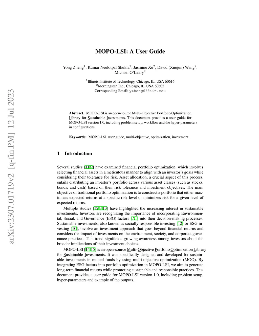 MOPO-LSI is an open-source Multi-Objective Portfolio Optimization Library for Sustainable Investments. This document provides a user guide for MOPO-LSI version 1.0, including problem setup, workflow and the hyper-parameters in configurations.