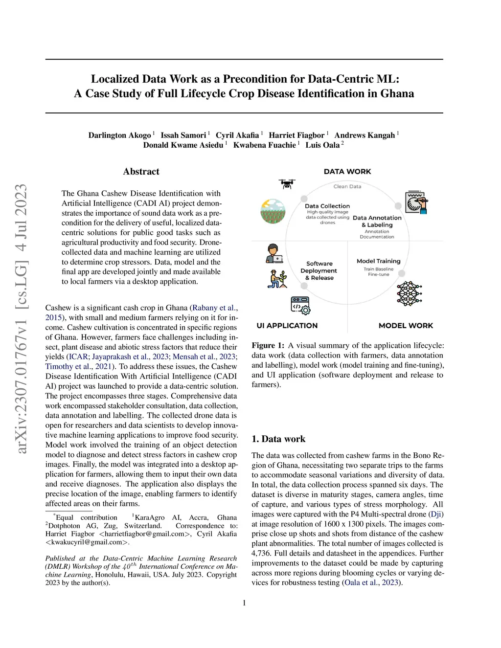 The Ghana Cashew Disease Identification with Artificial Intelligence (CADI AI) project demonstrates the importance of sound data work as a precondition for the delivery of useful, localized datacentric solutions for public good tasks such as agricultural productivity and food security. Drone collected data and machine learning are utilized to determine crop stressors. Data, model and the final app are developed jointly and made available to local farmers via a desktop application.
