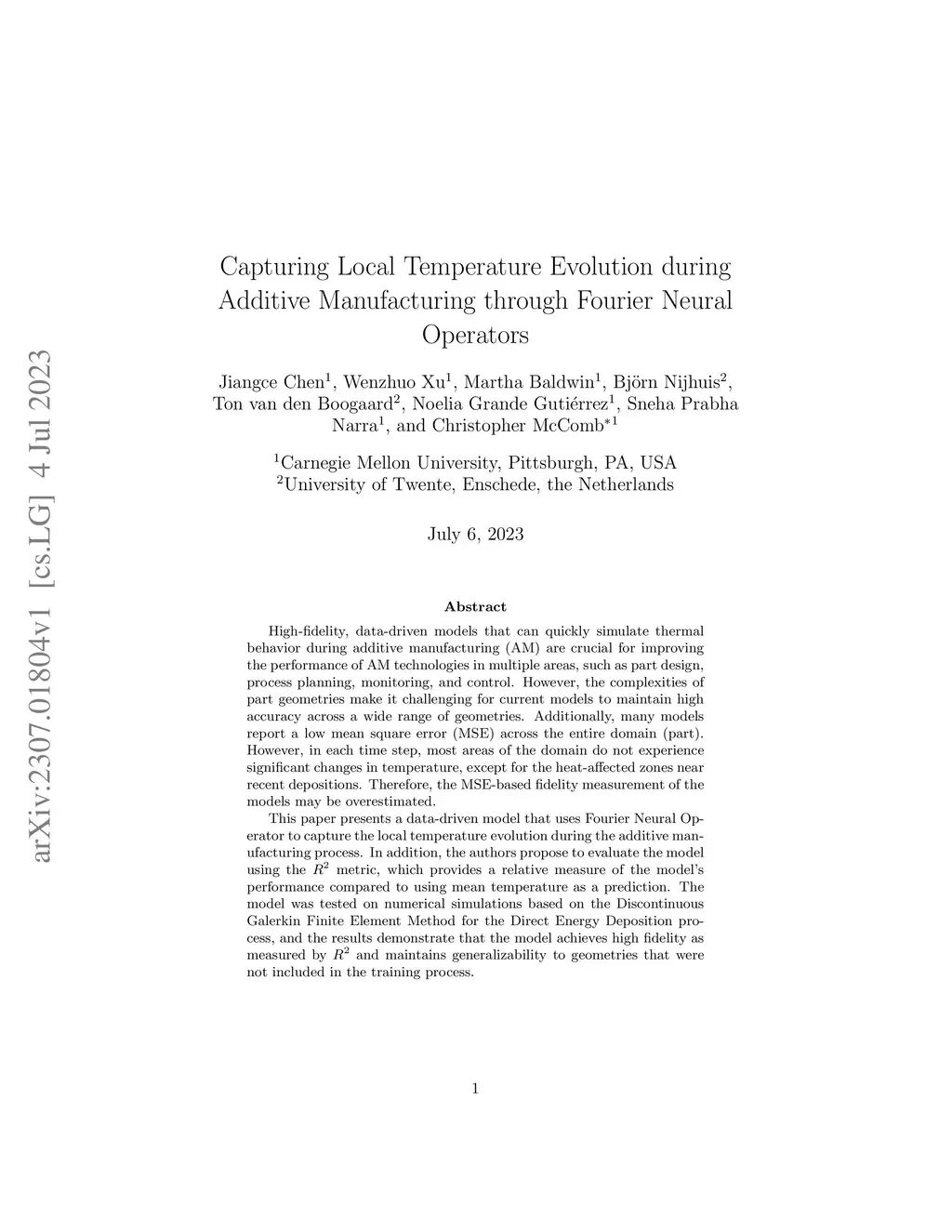 High-fidelity, data-driven models that can quickly simulate thermal behavior during additive manufacturing (AM) are crucial for improving the performance of AM technologies in multiple areas, such as part design, process planning, monitoring, and control. However, the complexities of part geometries make it challenging for current models to maintain high accuracy across a wide range of geometries. Additionally, many models report a low mean square error (MSE) across the entire domain (part). However, in each time step, most areas of the domain do not experience significant changes in temperature, except for the heat-affected zones near recent depositions. Therefore, the MSE-based fidelity measurement of the models may be overestimated. This paper presents a data-driven model that uses Fourier Neural Operator to capture the local temperature evolution during the additive manufacturing process. In addition, the authors propose to evaluate the model using the metric, which provides a relative measure of the model's performance compared to using mean temperature as a prediction. The model was tested on numerical simulations based on the Discontinuous Galerkin Finite Element Method for the Direct Energy Deposition process, and the results demonstrate that the model achieves high fidelity as measured by and maintains generalizability to geometries that were not included in the training process.