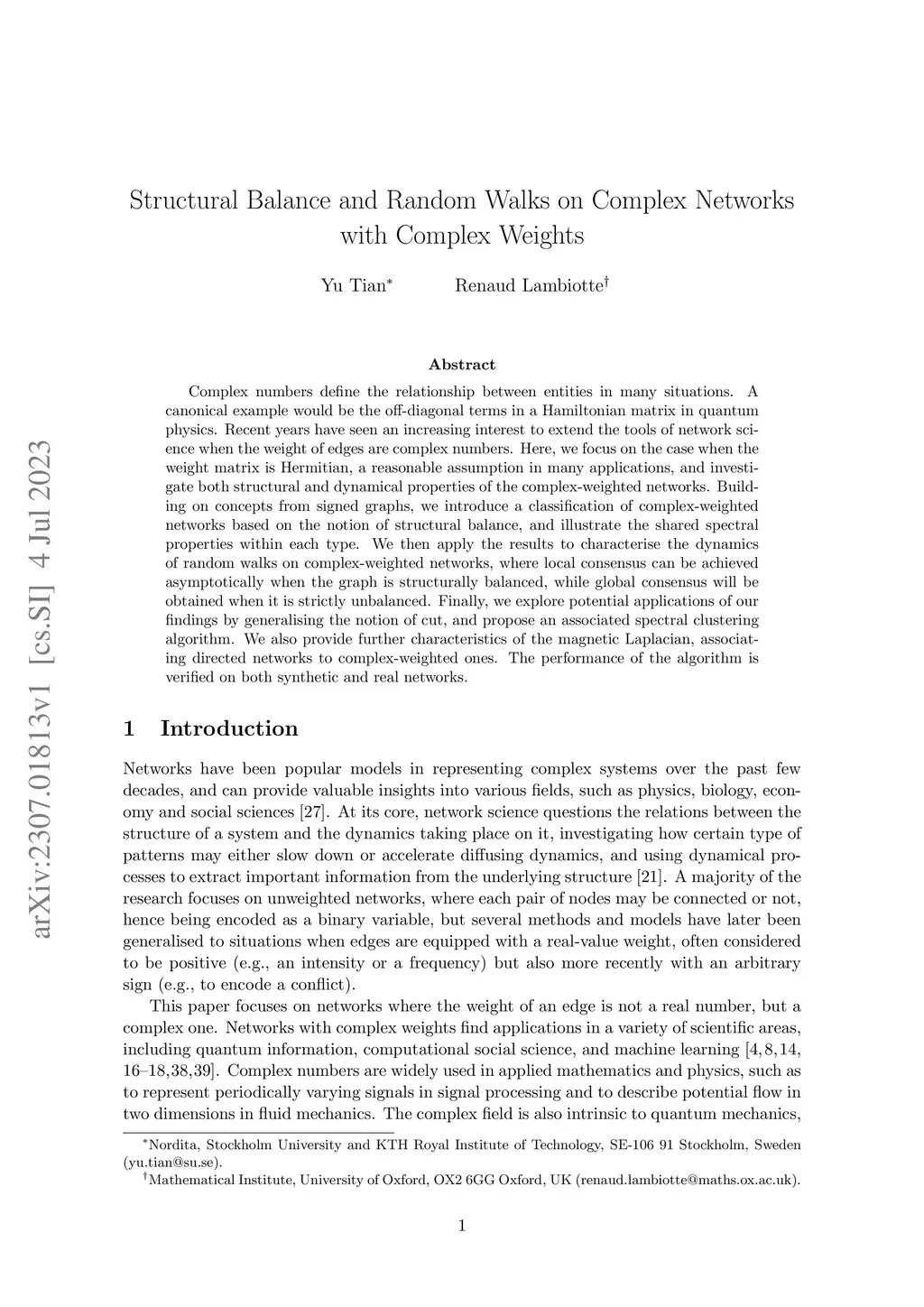 Complex numbers define the relationship between entities in many situations. A canonical example would be the off-diagonal terms in a Hamiltonian matrix in quantum physics. Recent years have seen an increasing interest to extend the tools of network science when the weight of edges are complex numbers. Here, we focus on the case when the weight matrix is Hermitian, a reasonable assumption in many applications, and investigate both structural and dynamical properties of the complex-weighted networks. Building on concepts from signed graphs, we introduce a classification of complex-weighted networks based on the notion of structural balance, and illustrate the shared spectral properties within each type. We then apply the results to characterise the dynamics of random walks on complex-weighted networks, where local consensus can be achieved asymptotically when the graph is structurally balanced, while global consensus will be obtained when it is strictly unbalanced. Finally, we explore potential applications of our findings by generalising the notion of cut, and propose an associated spectral clustering algorithm. We also provide further characteristics of the magnetic Laplacian, associating directed networks to complex-weighted ones. The performance of the algorithm is verified on both synthetic and real networks.