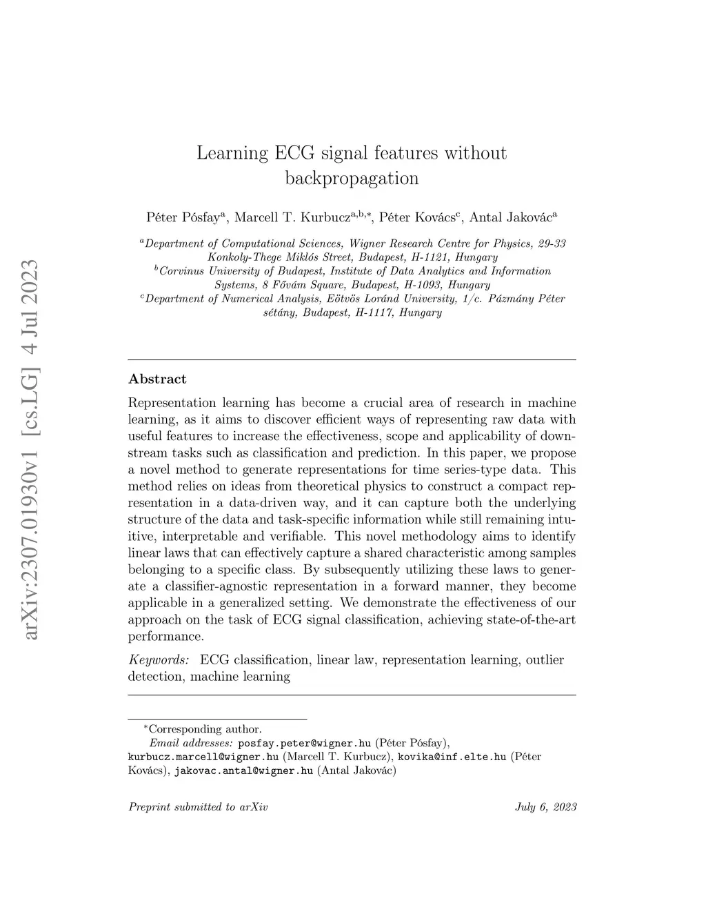Learning ECG signal features without backpropagation