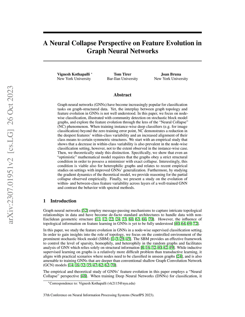 Graph neural networks (GNNs) have become increasingly popular for classification tasks on graph-structured data. Yet, the interplay between graph topology and feature evolution in GNNs is not well understood. In this paper, we focus on node-wise classification, illustrated with community detection on stochastic block model graphs, and explore the feature evolution through the lens of the "Neural Collapse" (NC) phenomenon. When training instance-wise deep classifiers (e.g. for image classification) beyond the zero training error point, NC demonstrates a reduction in the deepest features' within-class variability and an increased alignment of their class means to certain symmetric structures. We start with an empirical study that shows that a decrease in within-class variability is also prevalent in the node-wise classification setting, however, not to the extent observed in the instance-wise case. Then, we theoretically study this distinction. Specifically, we show that even an "optimistic" mathematical model requires that the graphs obey a strict structural condition in order to possess a minimizer with exact collapse. Interestingly, this condition is viable also for heterophilic graphs and relates to recent empirical studies on settings with improved GNNs' generalization. Furthermore, by studying the gradient dynamics of the theoretical model, we provide reasoning for the partial collapse observed empirically. Finally, we present a study on the evolution of within- and between-class feature variability across layers of a well-trained GNN and contrast the behavior with spectral methods.
