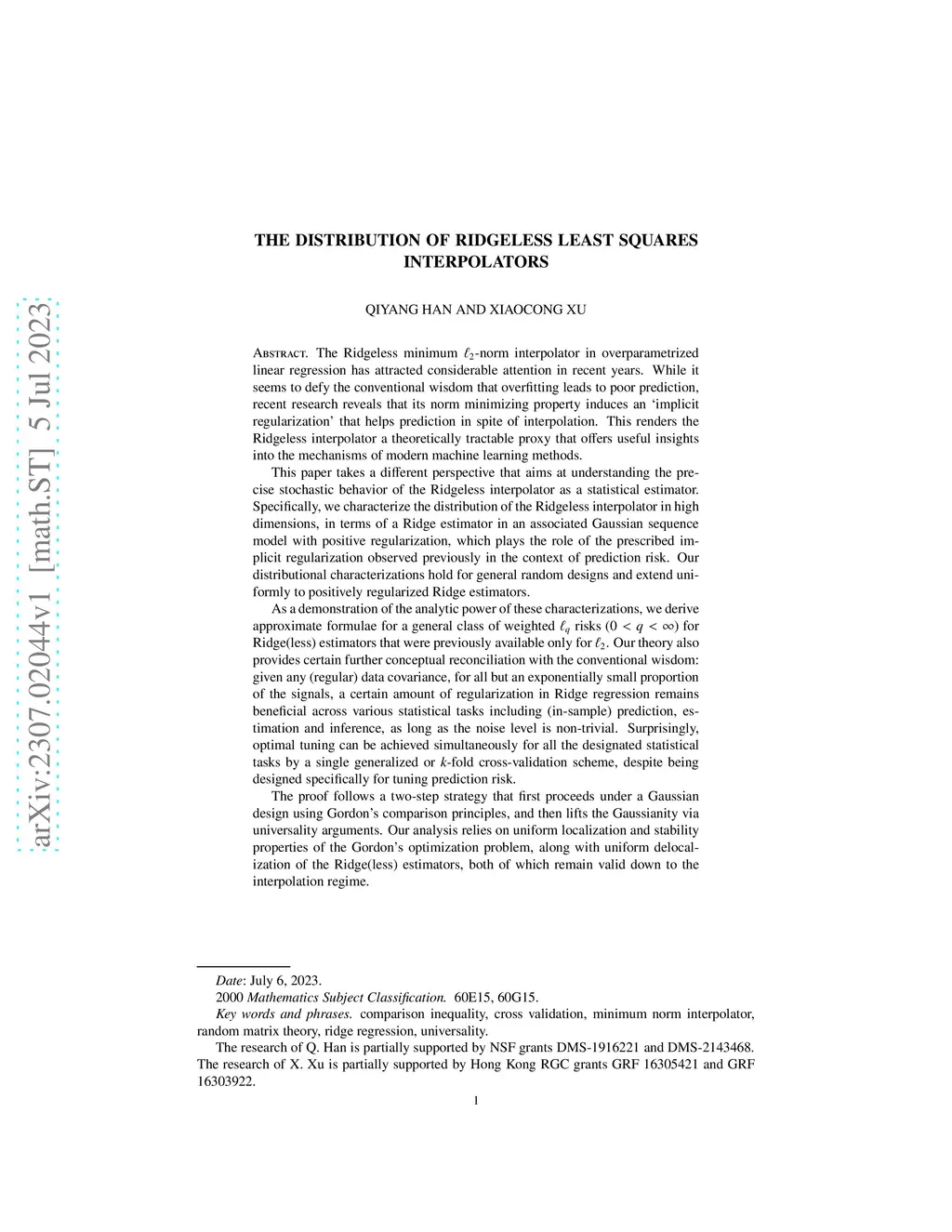 The Ridgeless minimum -norm interpolator in overparametrized linear regression has attracted considerable attention in recent years. While it seems to defy the conventional wisdom that overfitting leads to poor prediction, recent research reveals that its norm minimizing property induces an `implicit regularization' that helps prediction in spite of interpolation. This renders the Ridgeless interpolator a theoretically tractable proxy that offers useful insights into the mechanisms of modern machine learning methods. This paper takes a different perspective that aims at understanding the precise stochastic behavior of the Ridgeless interpolator as a statistical estimator. Specifically, we characterize the distribution of the Ridgeless interpolator in high dimensions, in terms of a Ridge estimator in an associated Gaussian sequence model with positive regularization, which plays the role of the prescribed implicit regularization in the context of prediction risk. Our distributional characterizations hold for general random designs and extend uniformly to positively regularized Ridge estimators. As a demonstration of the analytic power of these characterizations, we derive approximate formulae for a general class of weighted risks for Ridge(less) estimators that were previously available only for . Our theory also provides certain further conceptual reconciliation with the conventional wisdom: given any data covariance, a certain amount of regularization in Ridge regression remains beneficial for `most' signals across various statistical tasks including prediction, estimation and inference, as long as the noise level is non-trivial. Surprisingly, optimal tuning can be achieved simultaneously for all the designated statistical tasks by a single generalized or -fold cross-validation scheme, despite being designed specifically for tuning prediction risk.