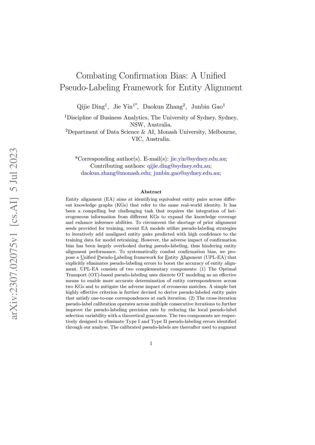Entity alignment (EA) aims at identifying equivalent entity pairs across different knowledge graphs (KGs) that refer to the same real-world identity. To circumvent the shortage of seed alignments provided for training, recent EA models utilize pseudo-labeling strategies to iteratively add unaligned entity pairs predicted with high confidence to the seed alignments for model training. However, the adverse impact of confirmation bias during pseudo-labeling has been largely overlooked, thus hindering entity alignment performance. To systematically combat confirmation bias for pseudo-labeling-based entity alignment, we propose a Unified Pseudo-Labeling framework for Entity Alignment (UPL-EA) that explicitly eliminates pseudo-labeling errors to boost the accuracy of entity alignment. UPL-EA consists of two complementary components: (1) Optimal Transport (OT)-based pseudo-labeling uses discrete OT modeling as an effective means to determine entity correspondences and reduce erroneous matches across two KGs. An effective criterion is derived to infer pseudo-labeled alignments that satisfy one-to-one correspondences; (2) Parallel pseudo-label ensembling refines pseudo-labeled alignments by combining predictions over multiple models independently trained in parallel. The ensembled pseudo-labeled alignments are thereafter used to augment seed alignments to reinforce subsequent model training for alignment inference. The effectiveness of UPL-EA in eliminating pseudo-labeling errors is both theoretically supported and experimentally validated. Our extensive results and in-depth analyses demonstrate the superiority of UPL-EA over 15 competitive baselines and its utility as a general pseudo-labeling framework for entity alignment.