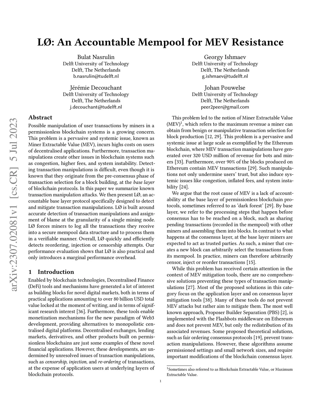 Possible manipulation of user transactions by miners in a permissionless blockchain systems is a growing concern. This problem is a pervasive and systemic issue, known as Miner Extractable Value (MEV), incurs highs costs on users of decentralised applications. Furthermore, transaction manipulations create other issues in blockchain systems such as congestion, higher fees, and system instability. Detecting transaction manipulations is difficult, even though it is known that they originate from the pre-consensus phase of transaction selection for a block building, at the base layer of blockchain protocols. In this paper we summarize known transaction manipulation attacks. We then present L{\O}, an accountable base layer protocol specifically designed to detect and mitigate transaction manipulations. L{\O} is built around accurate detection of transaction manipulations and assignment of blame at the granularity of a single mining node. L{\O} forces miners to log all the transactions they receive into a secure mempool data structure and to process them in a verifiable manner. Overall, L{\O} quickly and efficiently detects reordering, injection or censorship attempts. Our performance evaluation shows that L{\O} is also practical and only introduces a marginal performance overhead.