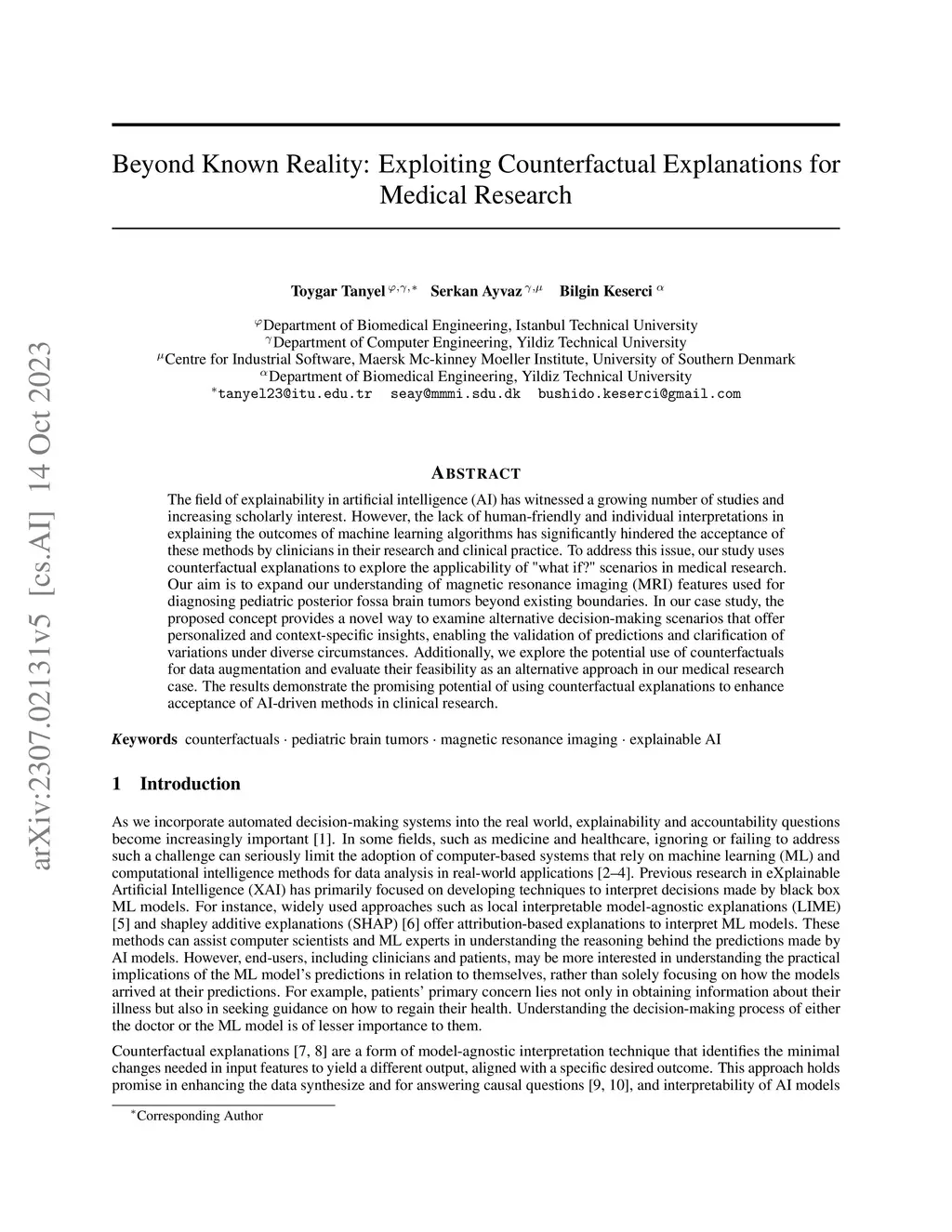 The field of explainability in artificial intelligence (AI) has witnessed a growing number of studies and increasing scholarly interest. However, the lack of human-friendly and individual interpretations in explaining the outcomes of machine learning algorithms has significantly hindered the acceptance of these methods by clinicians in their research and clinical practice. To address this issue, our study uses counterfactual explanations to explore the applicability of "what if?" scenarios in medical research. Our aim is to expand our understanding of magnetic resonance imaging (MRI) features used for diagnosing pediatric posterior fossa brain tumors beyond existing boundaries. In our case study, the proposed concept provides a novel way to examine alternative decision-making scenarios that offer personalized and context-specific insights, enabling the validation of predictions and clarification of variations under diverse circumstances. Additionally, we explore the potential use of counterfactuals for data augmentation and evaluate their feasibility as an alternative approach in our medical research case. The results demonstrate the promising potential of using counterfactual explanations to enhance acceptance of AI-driven methods in clinical research.